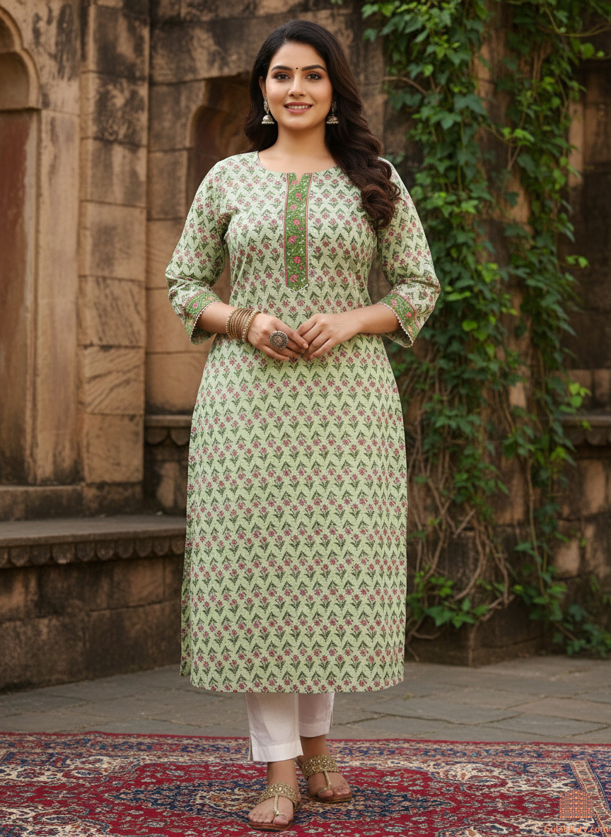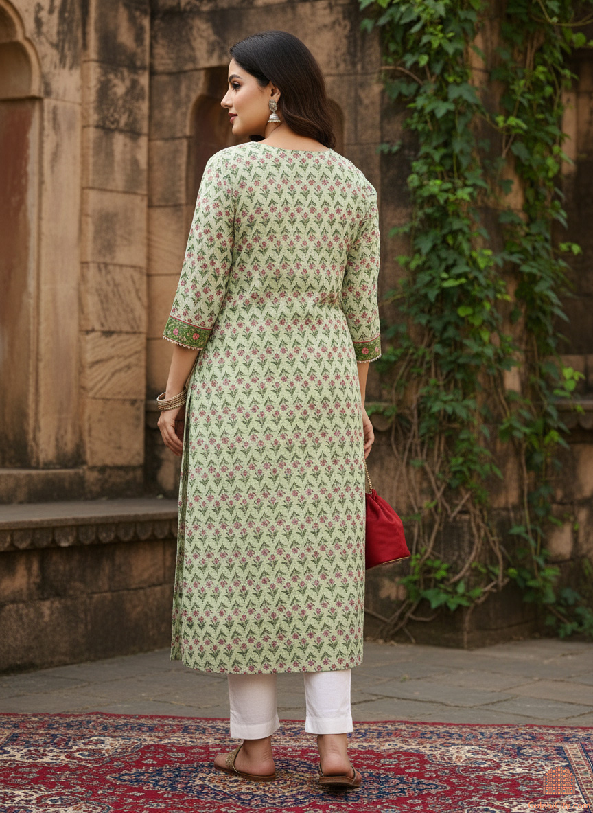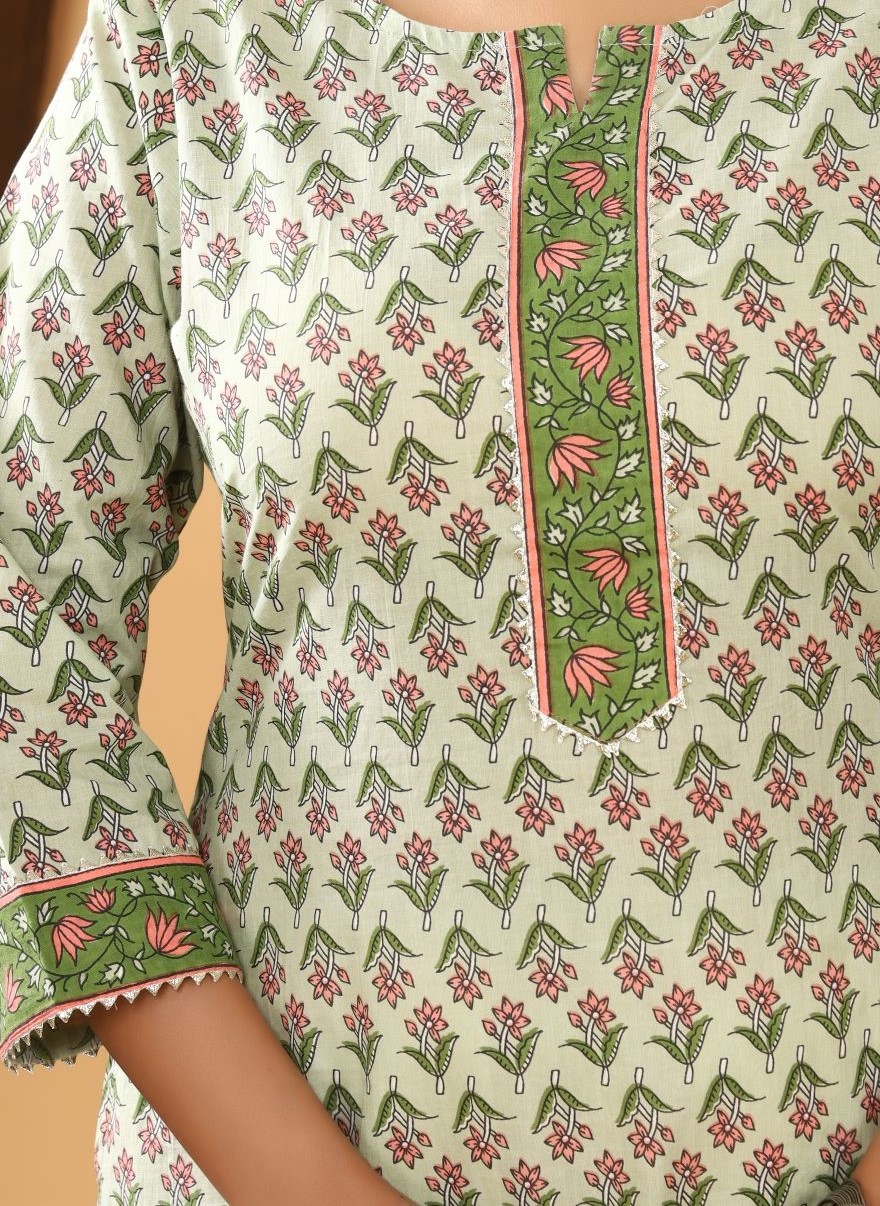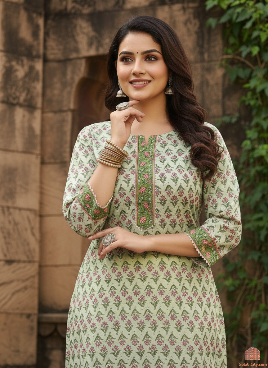 Elevate your everyday style with our Floral Print Kurti, a beautiful fusion of traditional artistry and modern comfort. Crafted from lightweight, breathable cotton, this kurti showcases an all-over floral block print in a refreshing shade-a striking example of India's rich textile heritage. The delicate motifs, created using natural, eco-friendly dyes, offer a soft yet captivating aesthetic. Sustainably made and kind to your skin, this kurti not only looks good but also aligns with conscious living. Thoughtfully designed for both comfort and versatility, it features flattering 3/4th sleeves and practical side pockets perfect for everything from casual outings to warm, sunny days. Whether you're dressing up or keeping it relaxed, this kurti effortlessly adapts to your mood and lifestyle.
