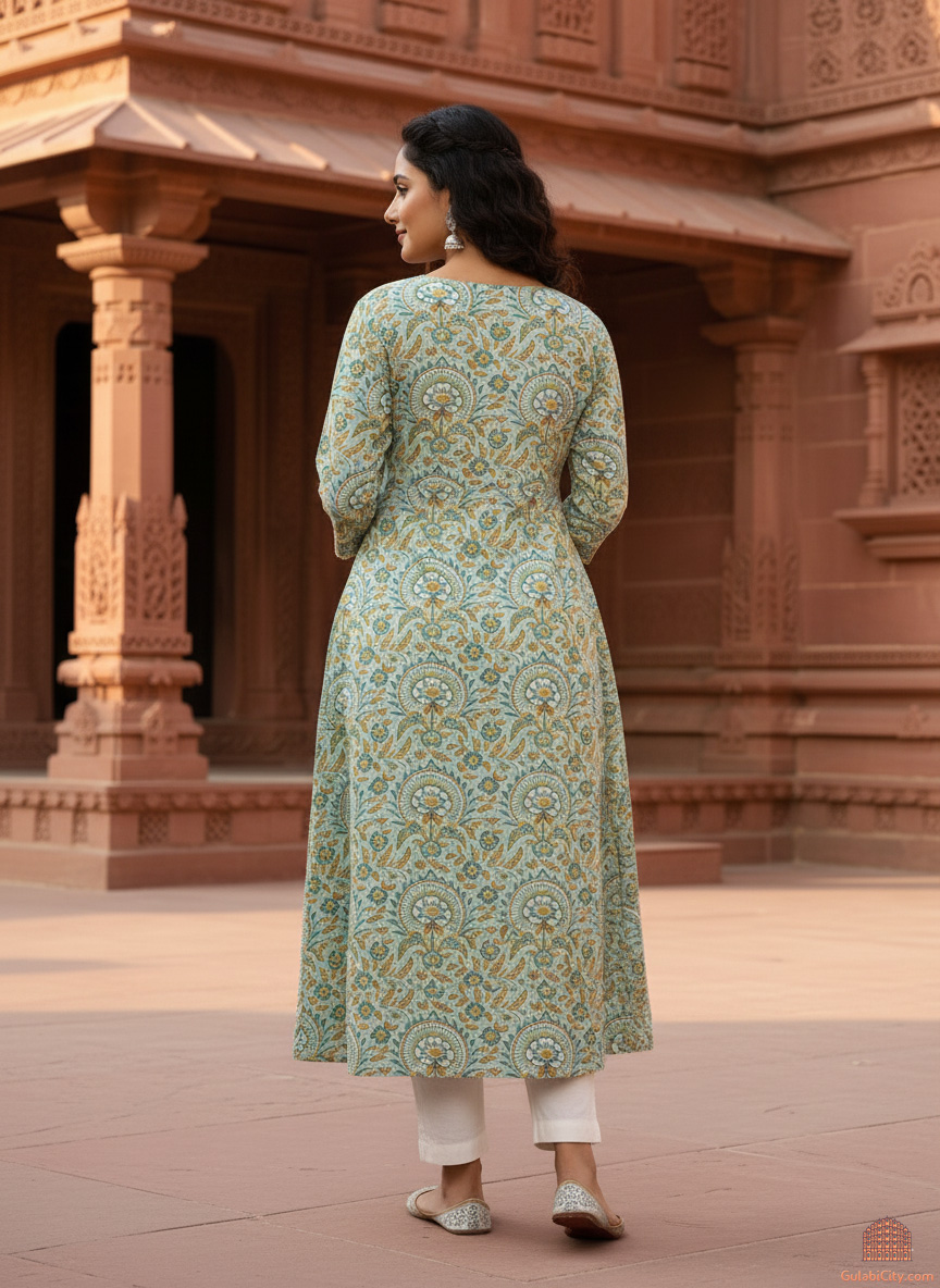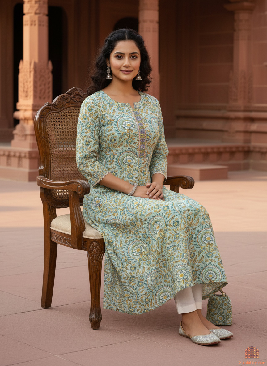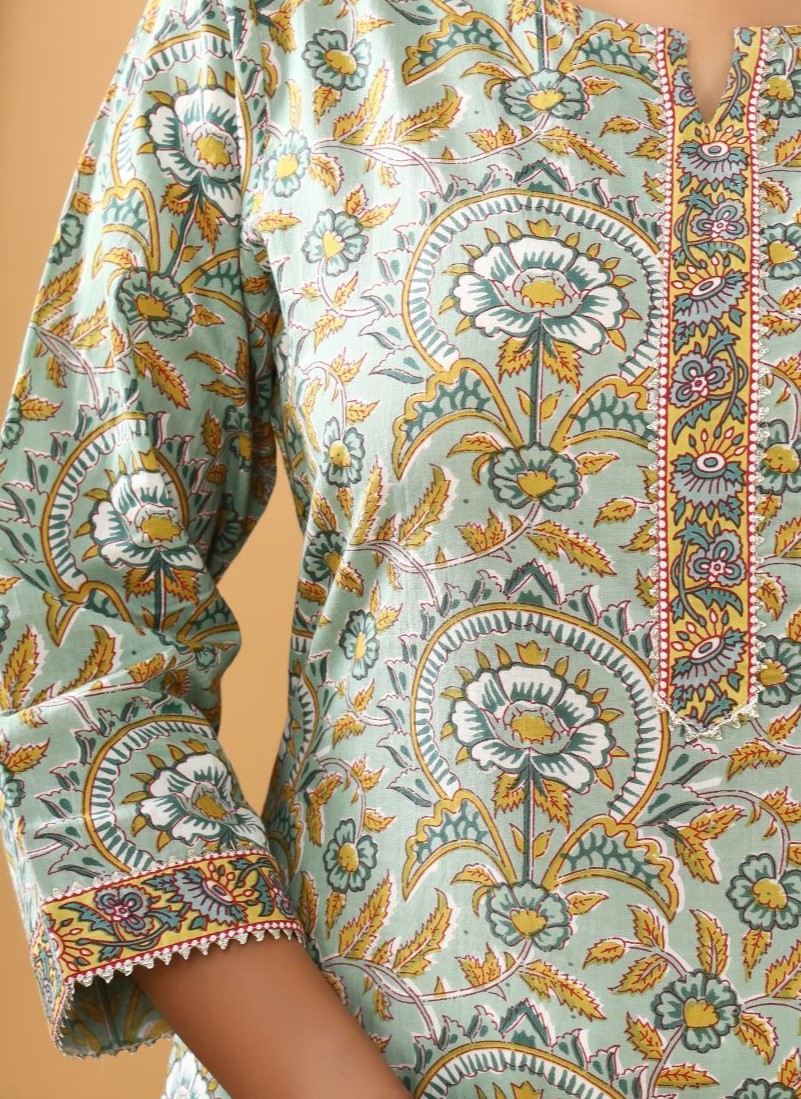 Elevate your everyday style with our Floral Print Kurti, a beautiful fusion of traditional artistry and modern comfort. Crafted from lightweight, breathable cotton, this kurti showcases an all-over floral block print in a refreshing shade-a striking example of India's rich textile heritage. The delicate motifs, created using natural, eco-friendly dyes, offer a soft yet captivating aesthetic. Sustainably made and kind to your skin, this kurti not only looks good but also aligns with conscious living. Thoughtfully designed for both comfort and versatility, it features flattering 3/4th sleeves and practical side pockets perfect for everything from casual outings to warm, sunny days. Whether you're dressing up or keeping it relaxed, this kurti effortlessly adapts to your mood and lifestyle.