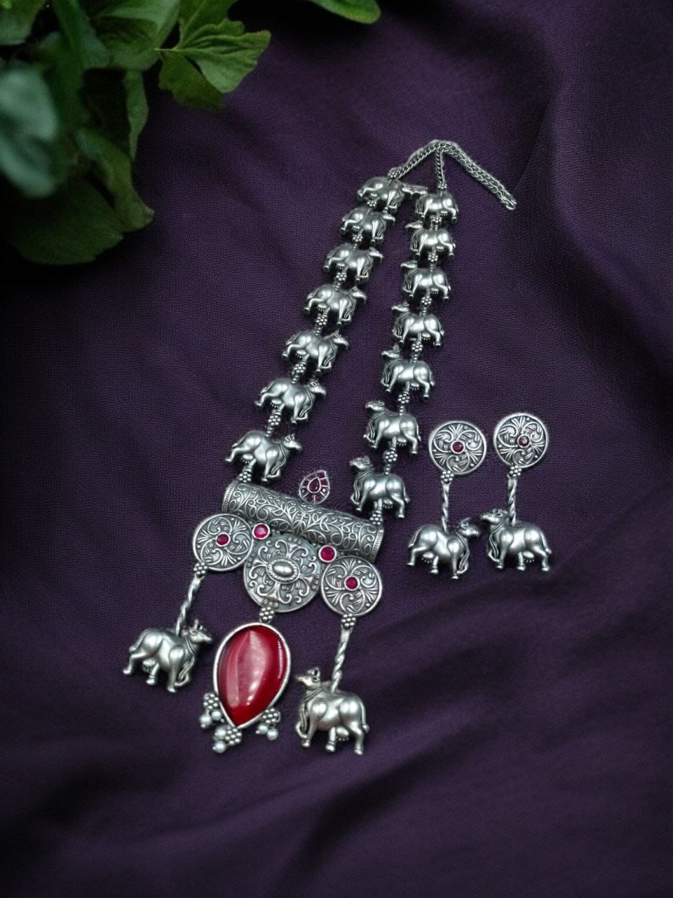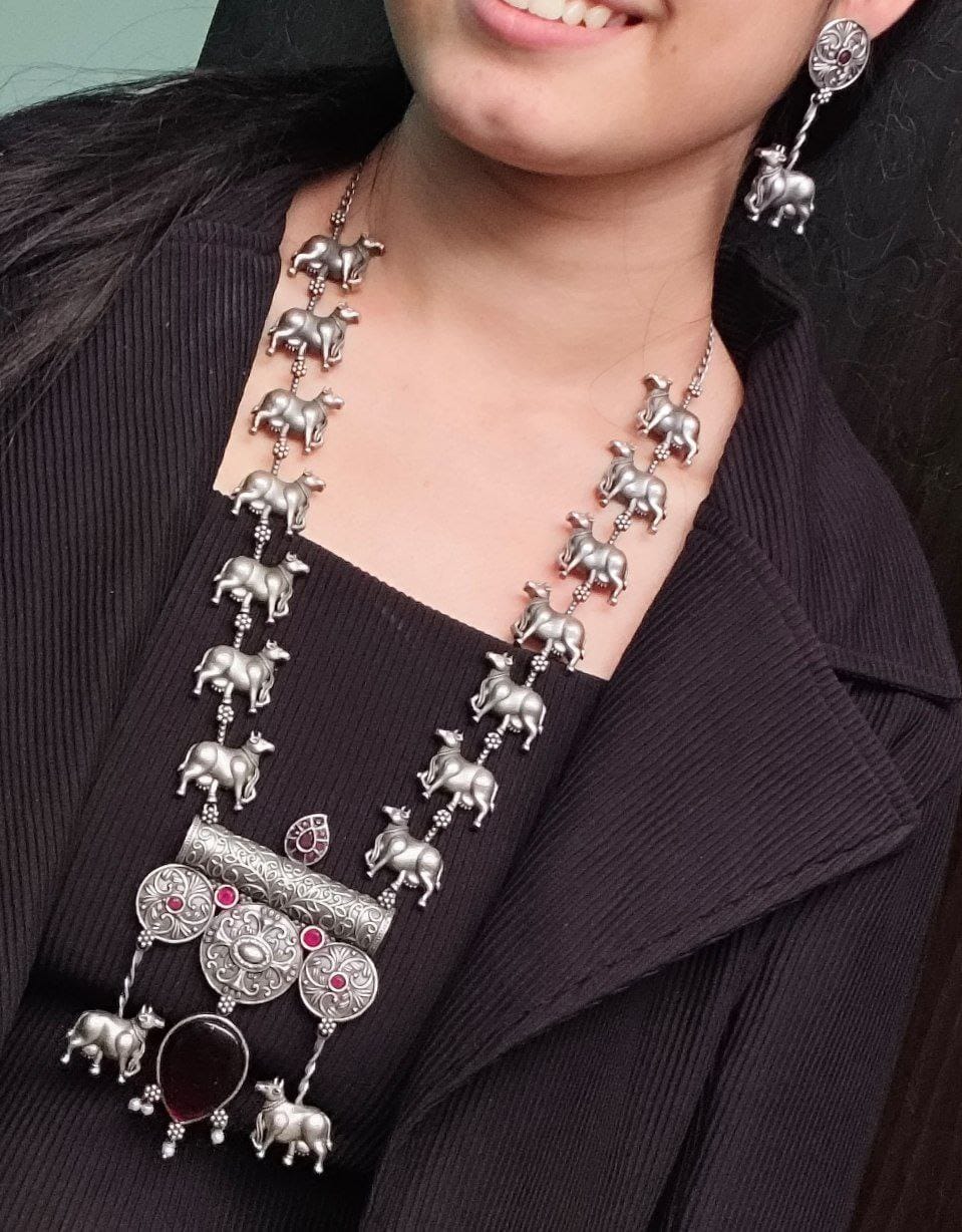 Red Antique Tribal Stylish Long Necklace Indian Cow Kamdhenu Ethnic Silver Oxidized Necklace with Earrings