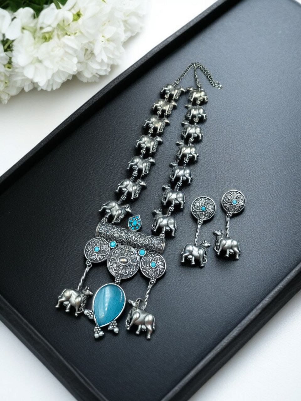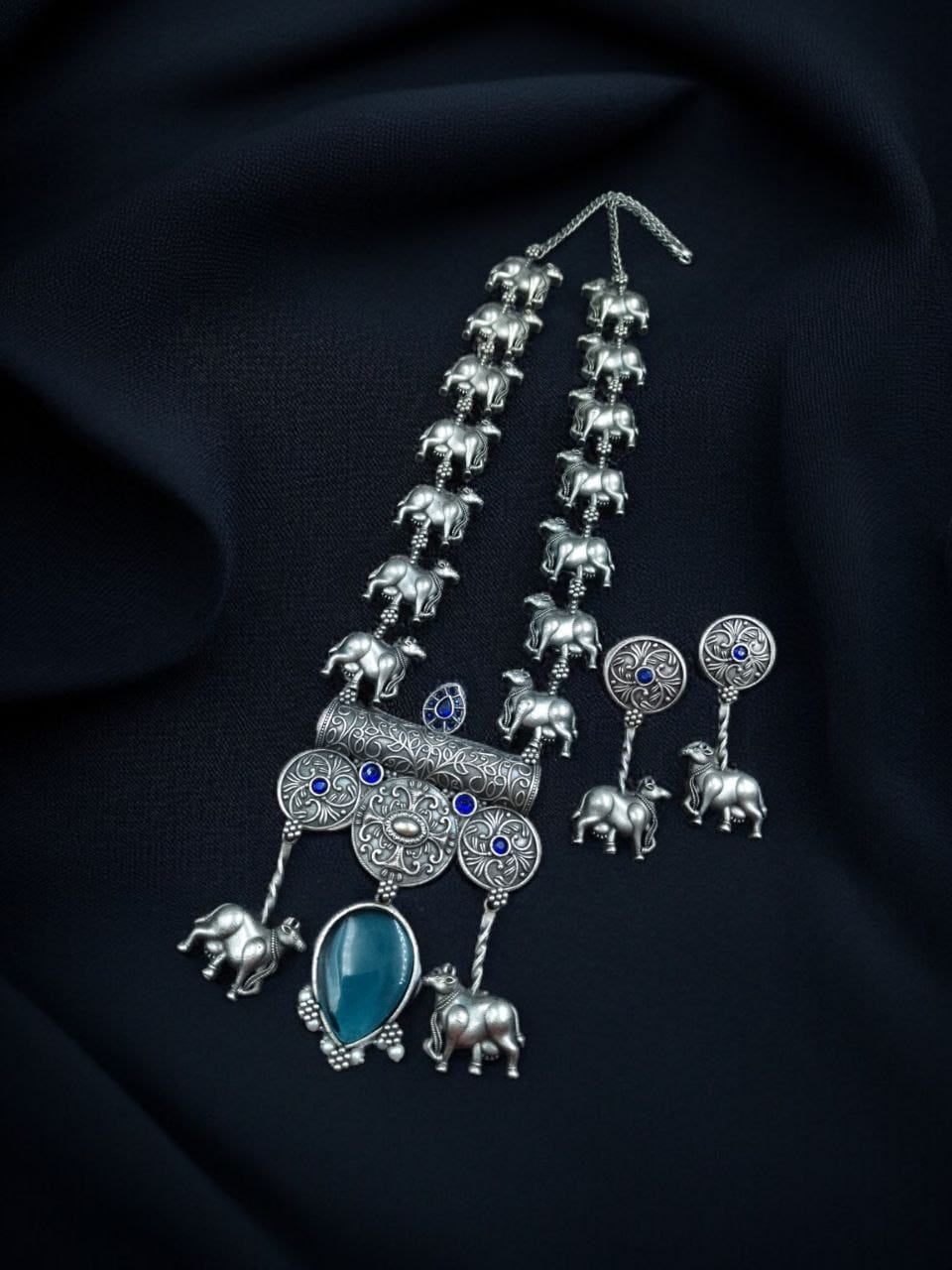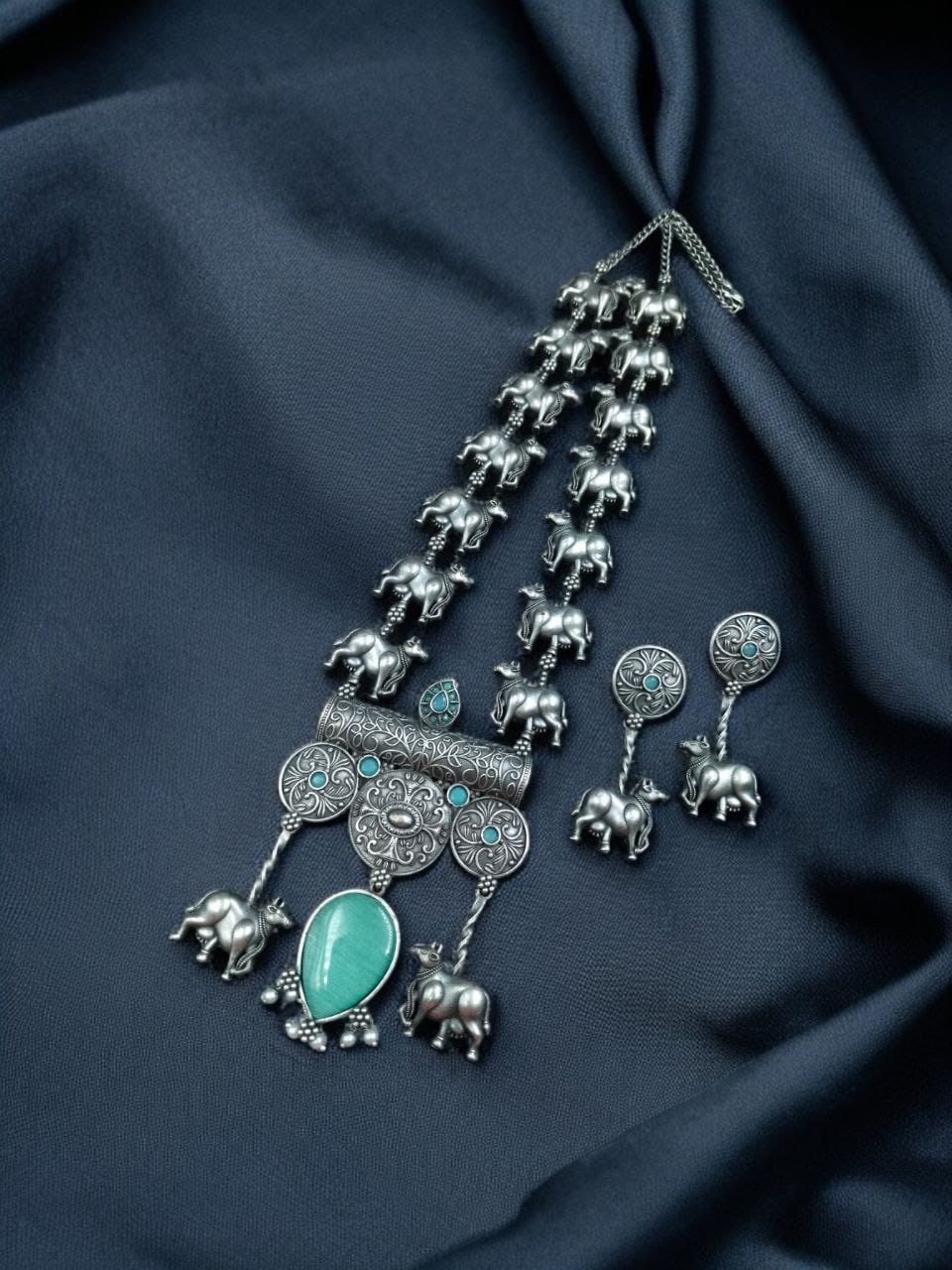 Aqua Antique Tribal Stylish Long Necklace Indian Cow Kamdhenu Ethnic Silver Oxidized Necklace with Earrings