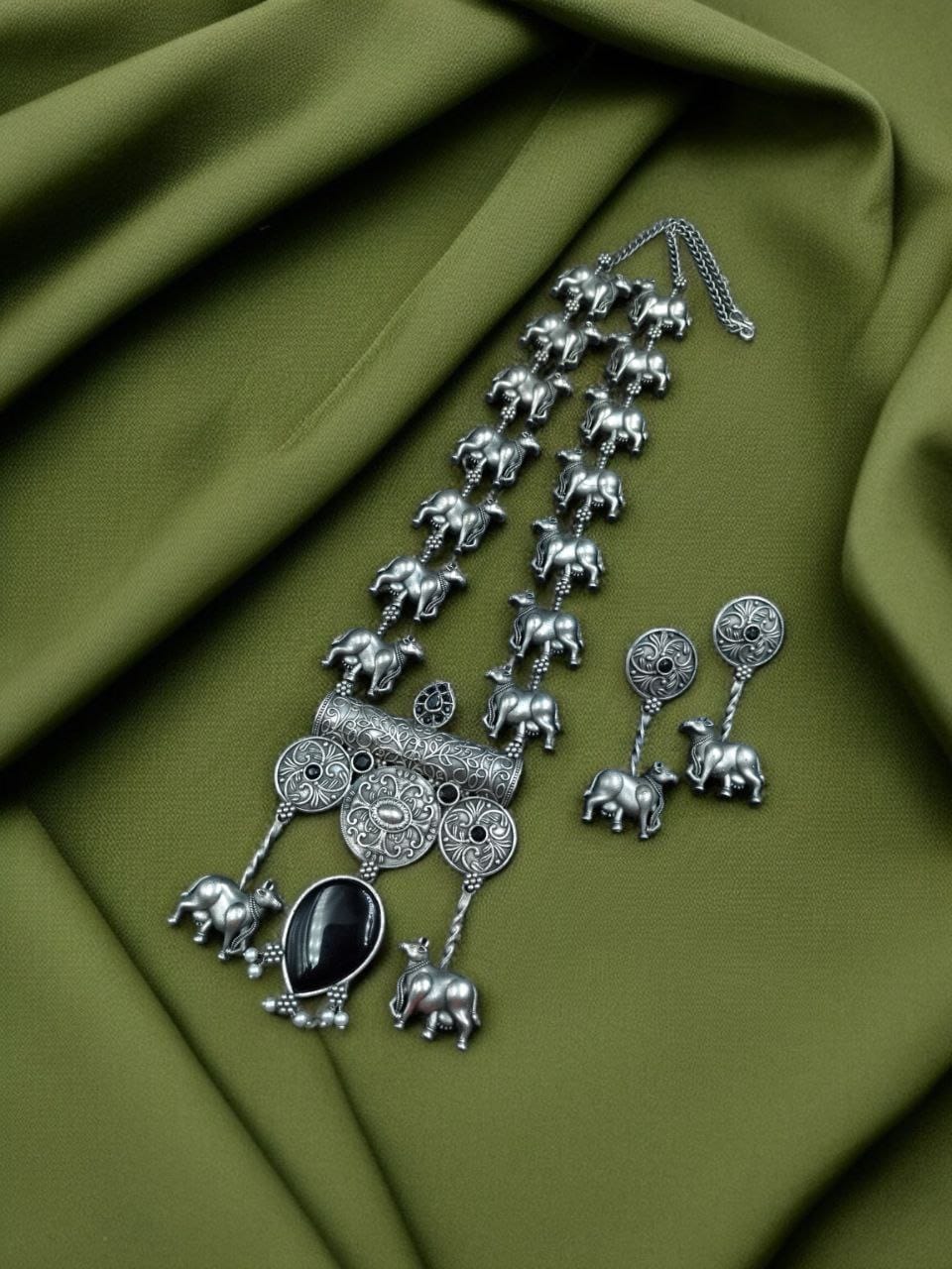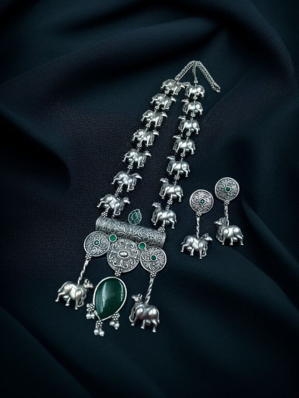 Green Antique Tribal Stylish Long Necklace Indian Cow Kamdhenu Ethnic Silver Oxidized Necklace with Earrings