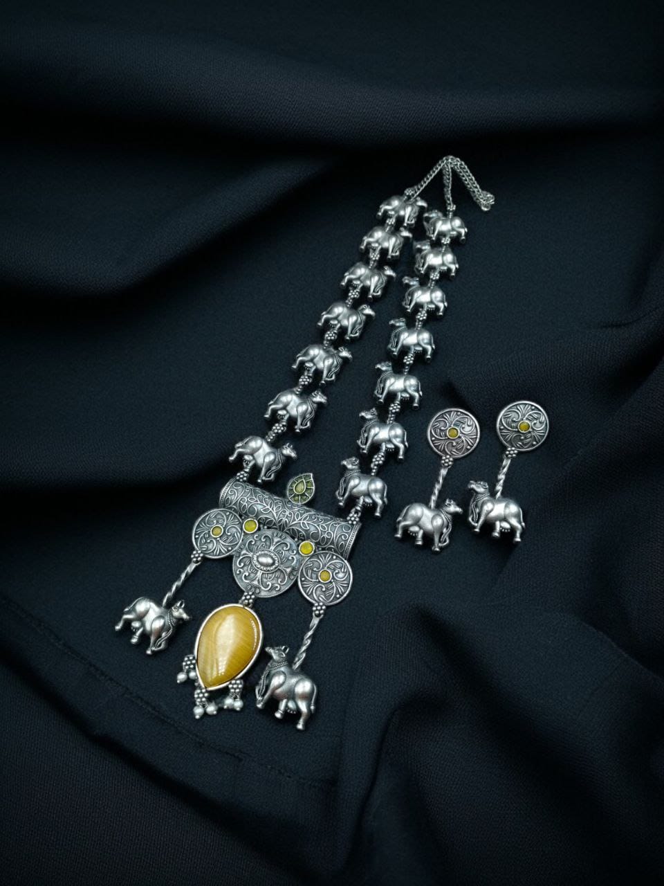 Yellow Antique Tribal Stylish Long Necklace Indian Cow Kamdhenu Ethnic Silver Oxidized Necklace with Earrings