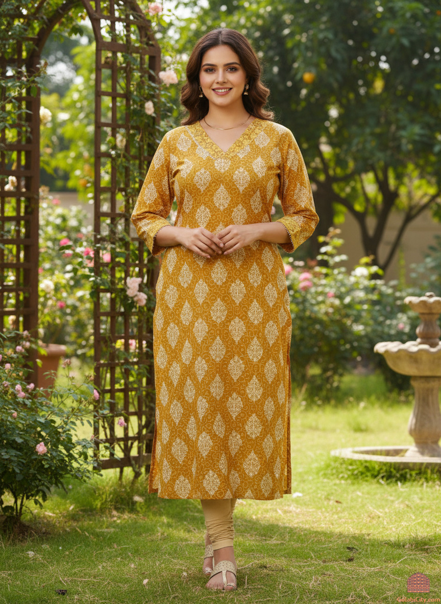 Mustard Color Plus Size Floral Print Cotton Straight Kurti Casual Tunic Top for Women (Kurti Only)