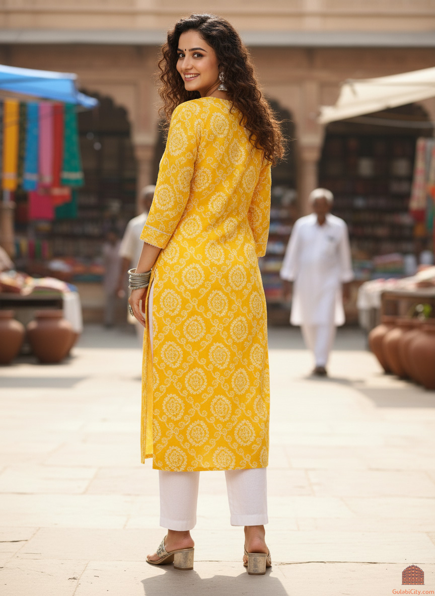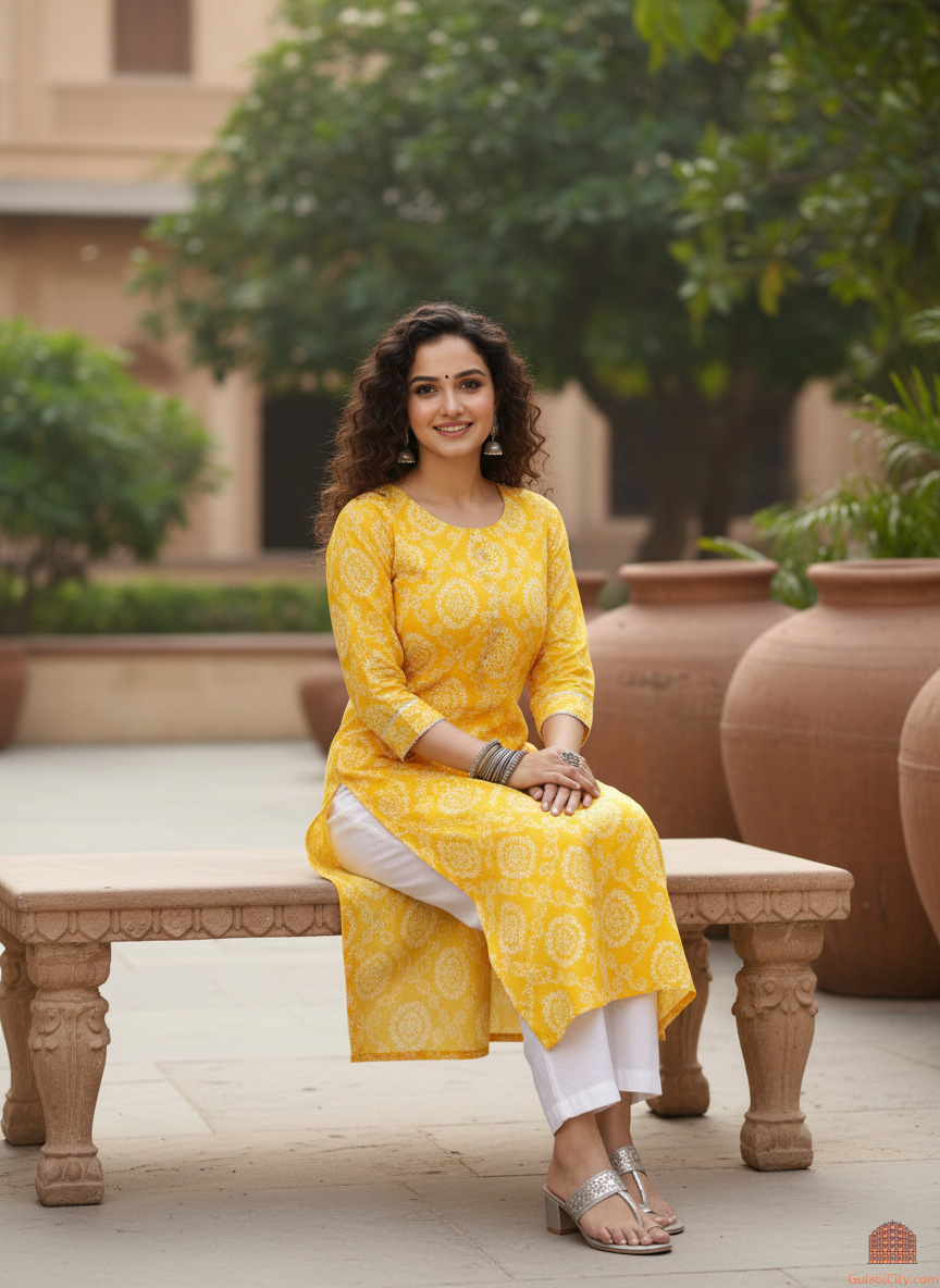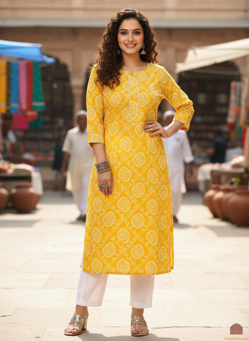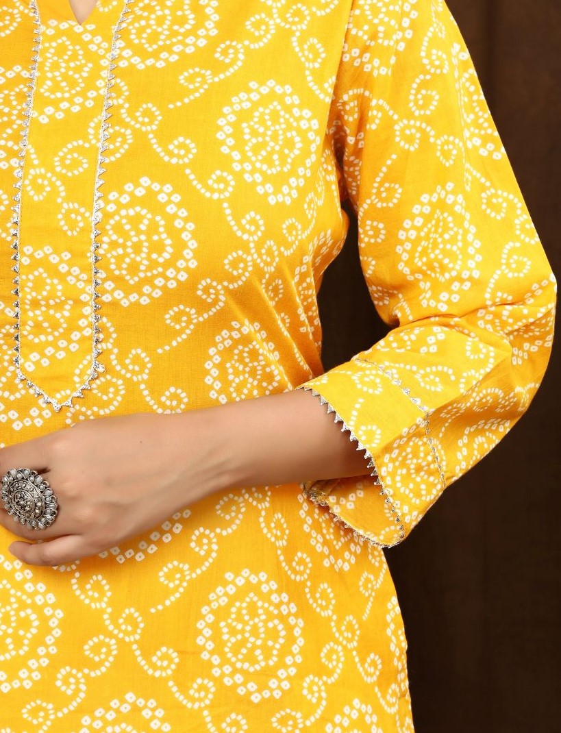 Elevate your everyday style with our Bandhej Print Kurti, a beautiful fusion of traditional artistry and modern comfort. Crafted from lightweight, breathable cotton, this kurti showcases an all-over bandhej block print in a refreshing shade-a striking example of India's rich textile heritage. The delicate motifs, created using natural, eco-friendly dyes, offer a soft yet captivating aesthetic. Sustainably made and kind to your skin, this kurti not only looks good but also aligns with conscious living. Thoughtfully designed for both comfort and versatility, it features flattering 3/4th sleeves and practical side pockets perfect for everything from casual outings to warm, sunny days. Whether you're dressing up or keeping it relaxed, this kurti effortlessly adapts to your mood and lifestyle.