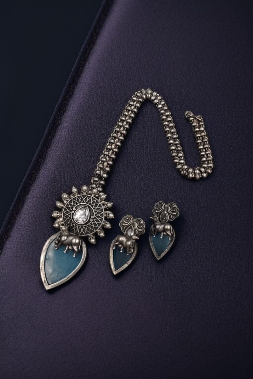 Blue Adorable Cow Kamdhenu Necklace Monalisa Stone Silver Oxidized Necklace with Matching Earring Set