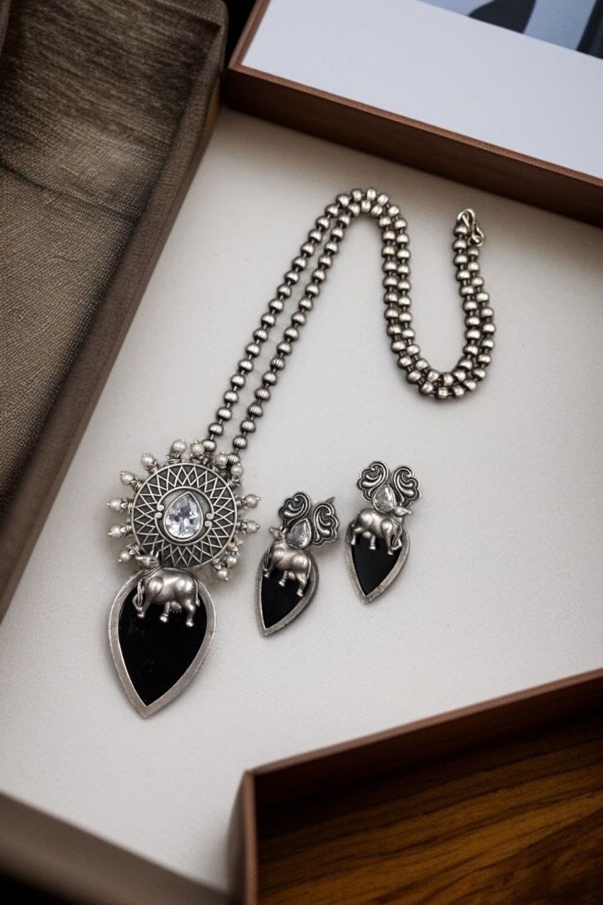 Black Adorable Cow Kamdhenu Necklace Monalisa Stone Silver Oxidized Necklace with Matching Earring Set