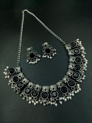 Grey Adorable Cow Kamdhenu Necklace Monalisa Stone Silver Oxidized Necklace with Matching Earring Set
