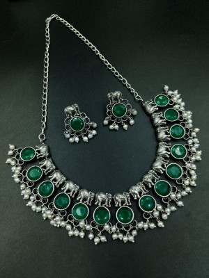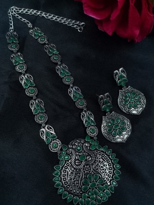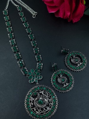 Green Adorable Cow Kamdhenu Necklace Monalisa Stone Silver Oxidized Necklace with Matching Earring Set