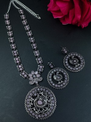 Purple Adorable Cow Kamdhenu Necklace Monalisa Stone Silver Oxidized Necklace with Matching Earring Set