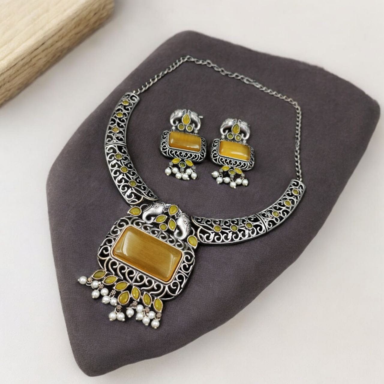 Yellow Tribal Elephant Designer Hasli Jewellery Ethnic Designer Indian Silver Oxidized Choker Necklace Set