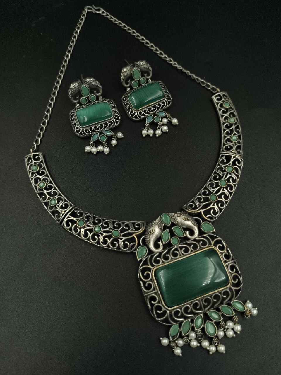 Mint Tribal Elephant Designer Hasli Jewellery Ethnic Designer Indian Silver Oxidized Choker Necklace Set