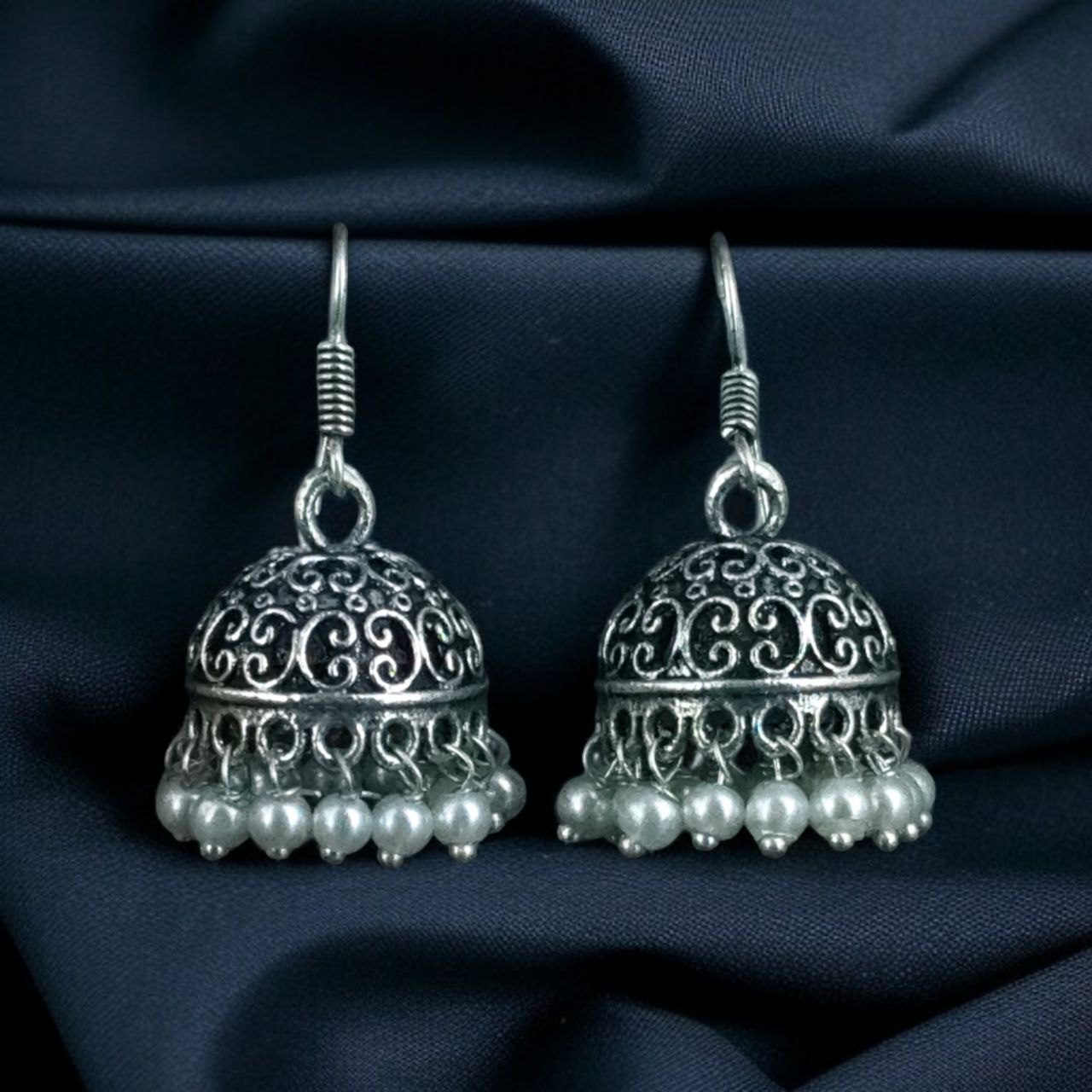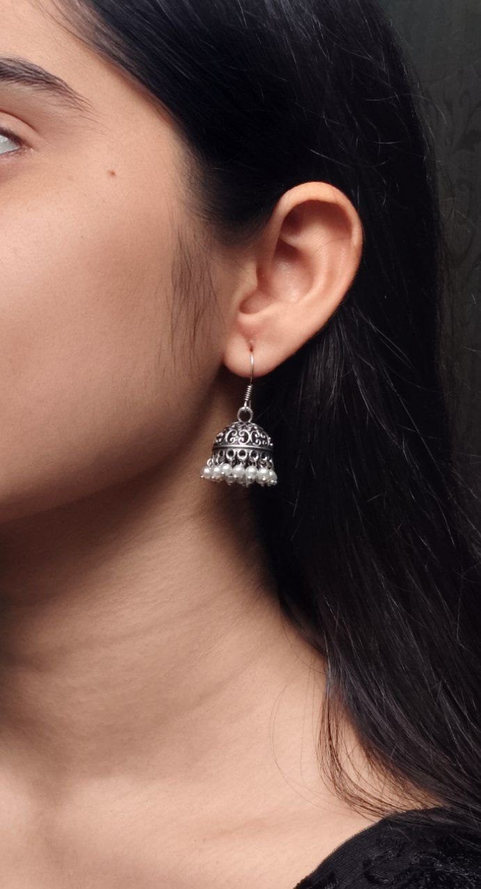 Designer Jhumka Indian Ethnic Silver Oxidized Earrings Jhumki with Pearl Beads Drop