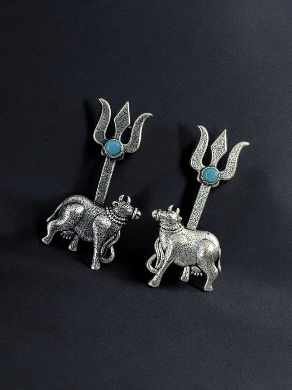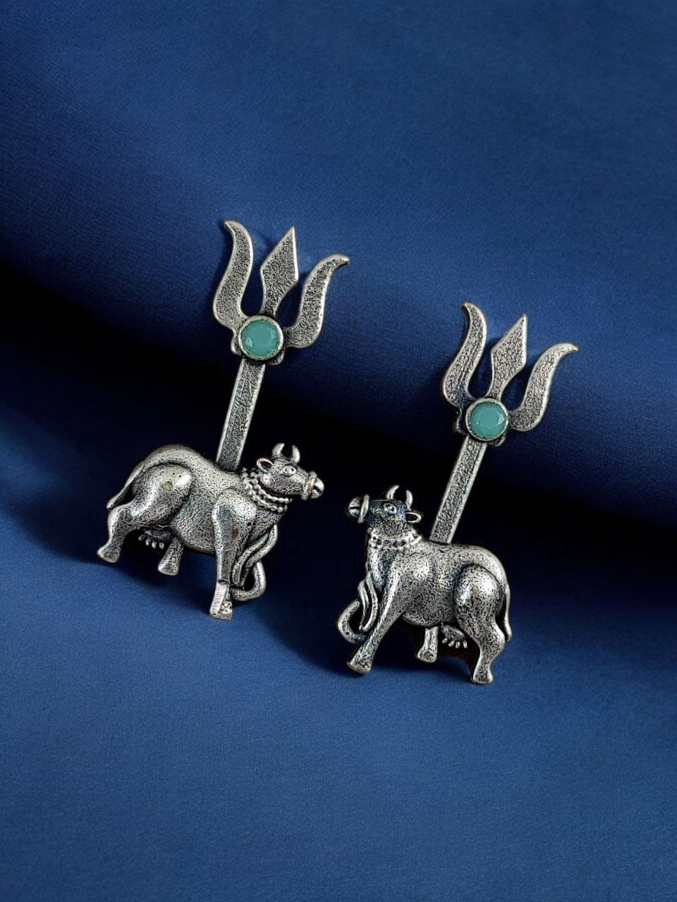 Aqua Traditional Trishul Kam Dhenu Cow Earrings in Brass Silver Replica Gypsy Casual Wear Jewellery for Women