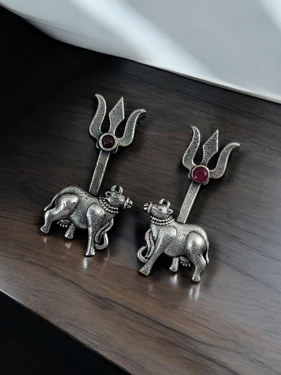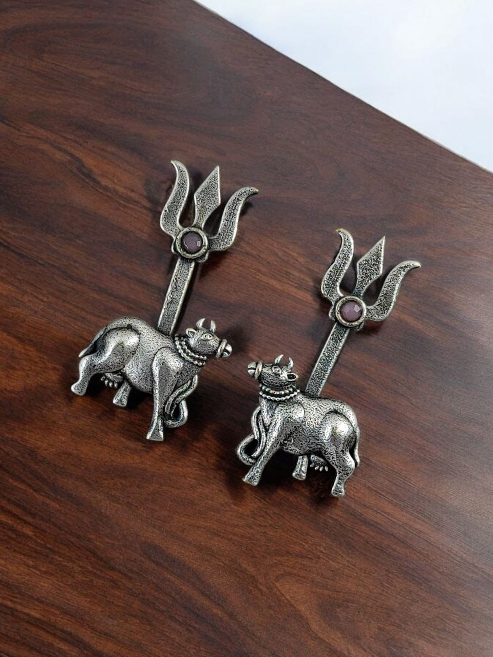 Traditional Trishul Kam Dhenu Cow Earrings in Brass Silver Replica Gypsy Casual Wear Jewellery for Women