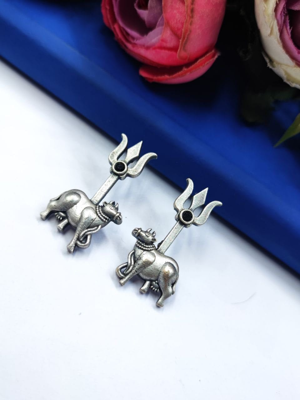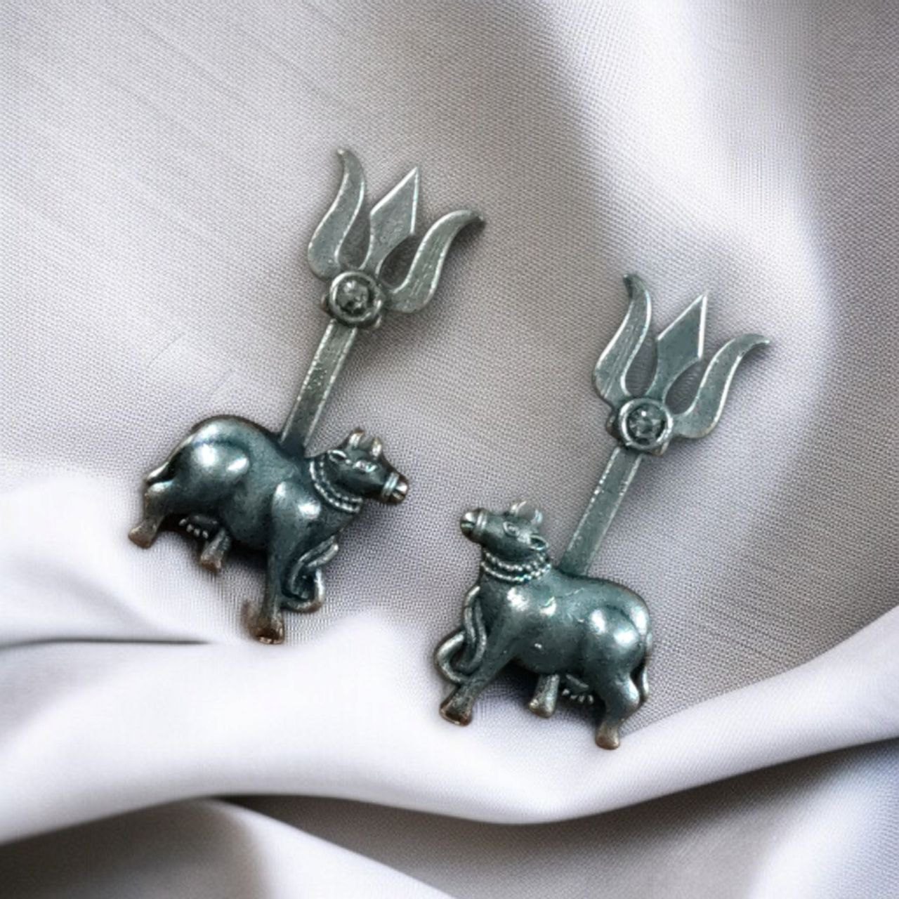 Mint Traditional Trishul Kam Dhenu Cow Earrings in Brass Silver Replica Gypsy Casual Wear Jewellery for Women