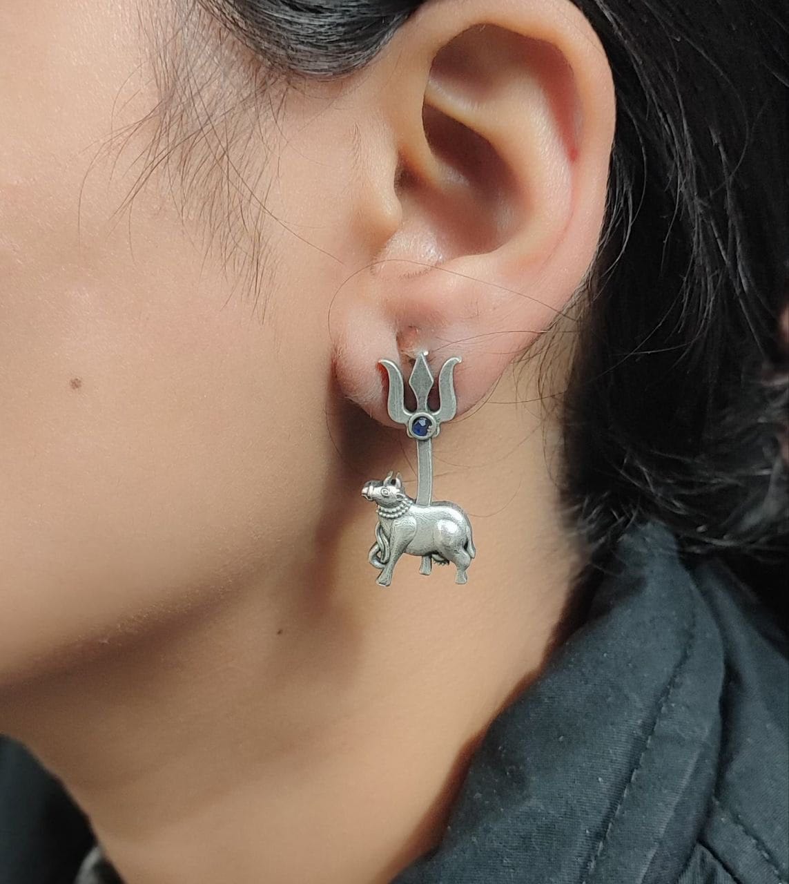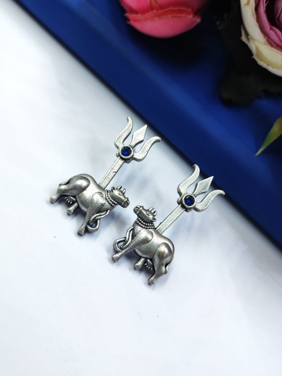 Blue Traditional Trishul Kam Dhenu Cow Earrings in Brass Silver Replica Gypsy Casual Wear Jewellery for Women