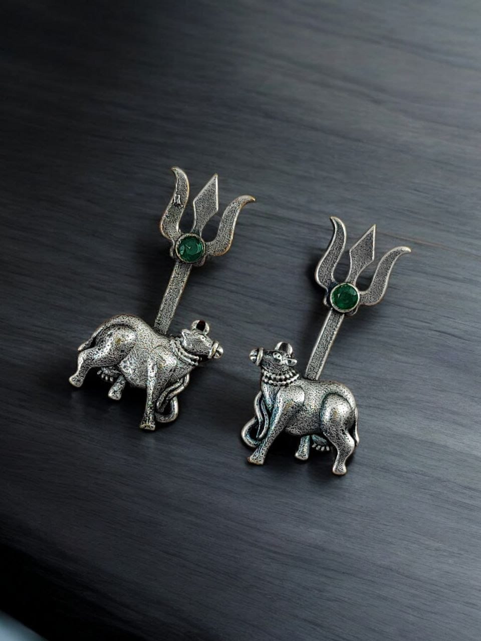 Green Traditional Trishul Kam Dhenu Cow Earrings in Brass Silver Replica Gypsy Casual Wear Jewellery for Women