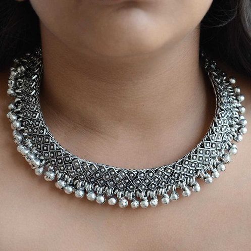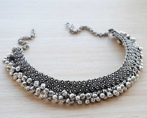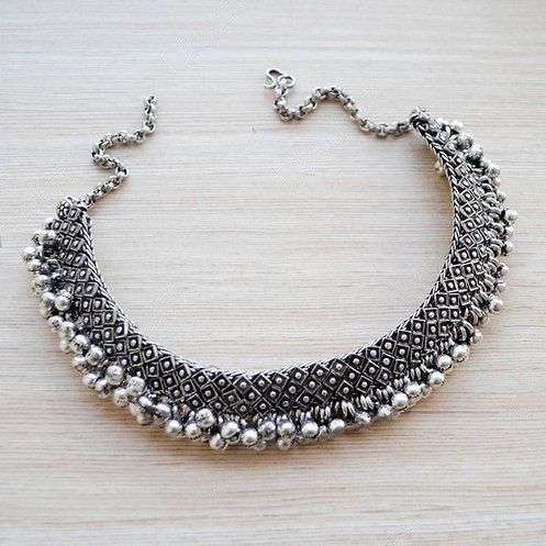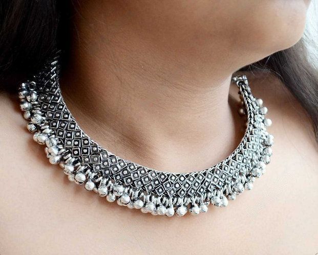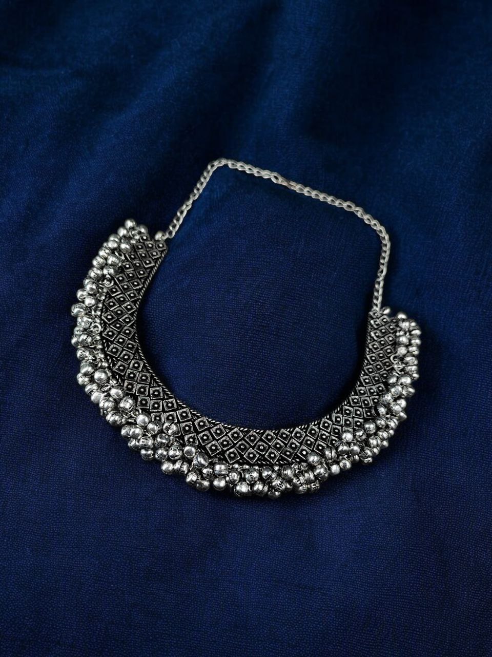 Retro Stylish Heavy Handmade Traditional Indian Silver Oxidized Choker Ghunghroo Necklace