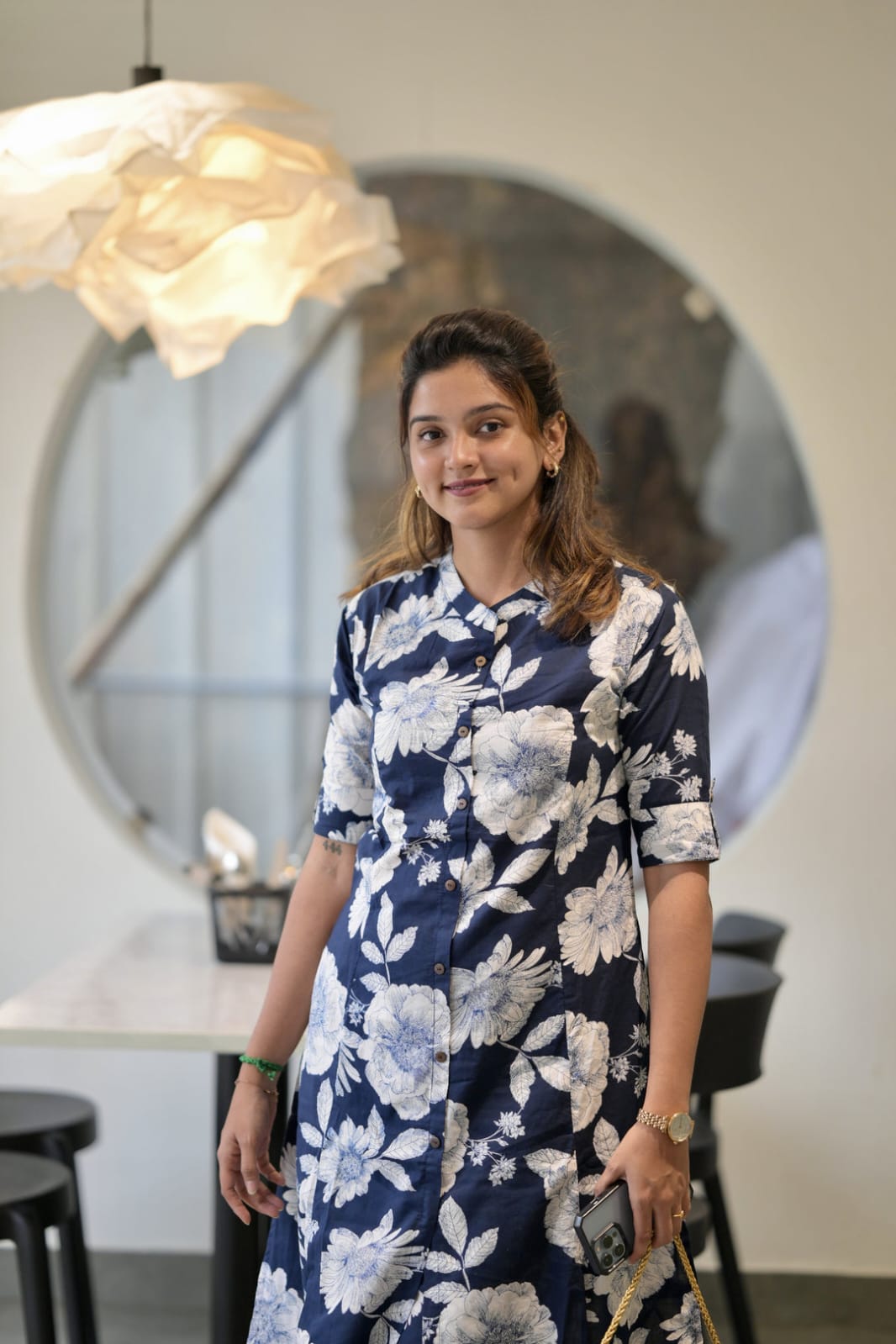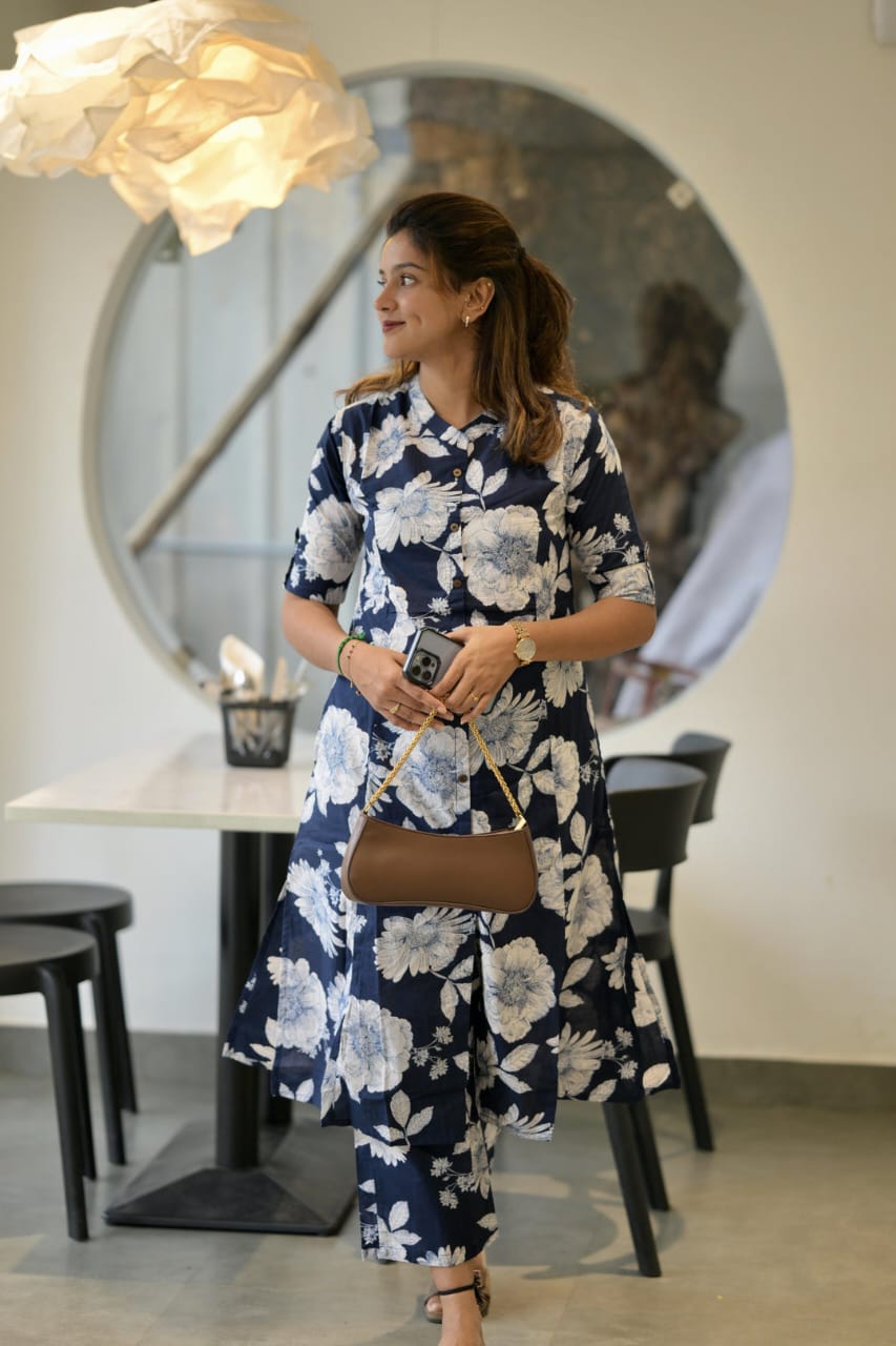 Blue Indian A-Line Floral Printed Cotton Salwar Kameez Kurti Pant Co Ord Set for Women (Set of 2)