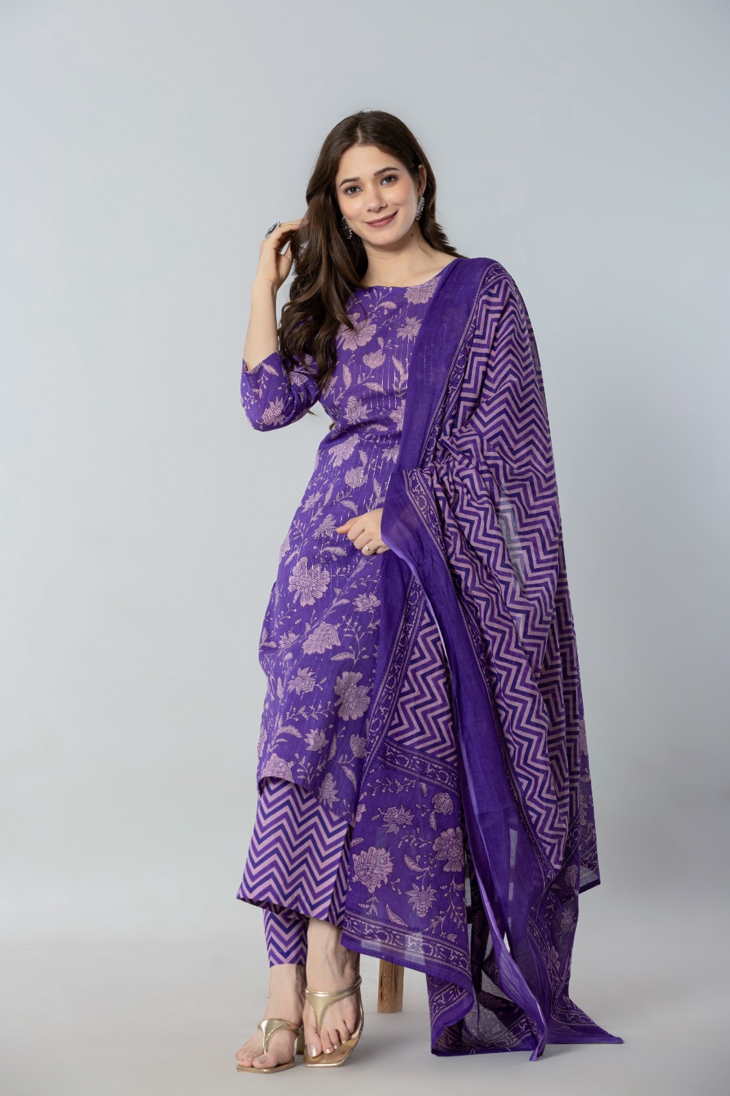 Embrace traditional elegance with our Blue Pink Floral Printed Straight Salwar Kameez Set. This beautiful Indian ensemble features a straight-cut kurti adorned with vibrant floral prints, offering a graceful yet modern appeal. The set includes a matching pair of comfortable pants and a lightweight dupatta, completing the classic look. Made from high-quality cotton lurex fabric, it's perfect for festive occasions, casual outings, or office wear, providing both comfort and style. The kurti's subtle design and soothing colors add a touch of sophistication, making it an ideal choice for any season. Pair it with ethnic jewelry and sandals for an effortlessly chic appearance.