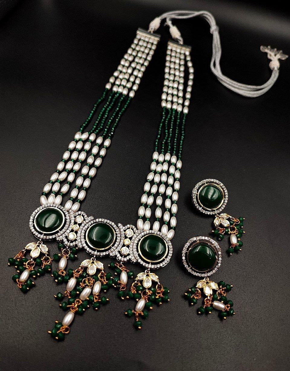 Green Elegant Kundan Monalisa Necklace Earring Set Party Wear Pearl Long Necklace Set Wedding Jewellery