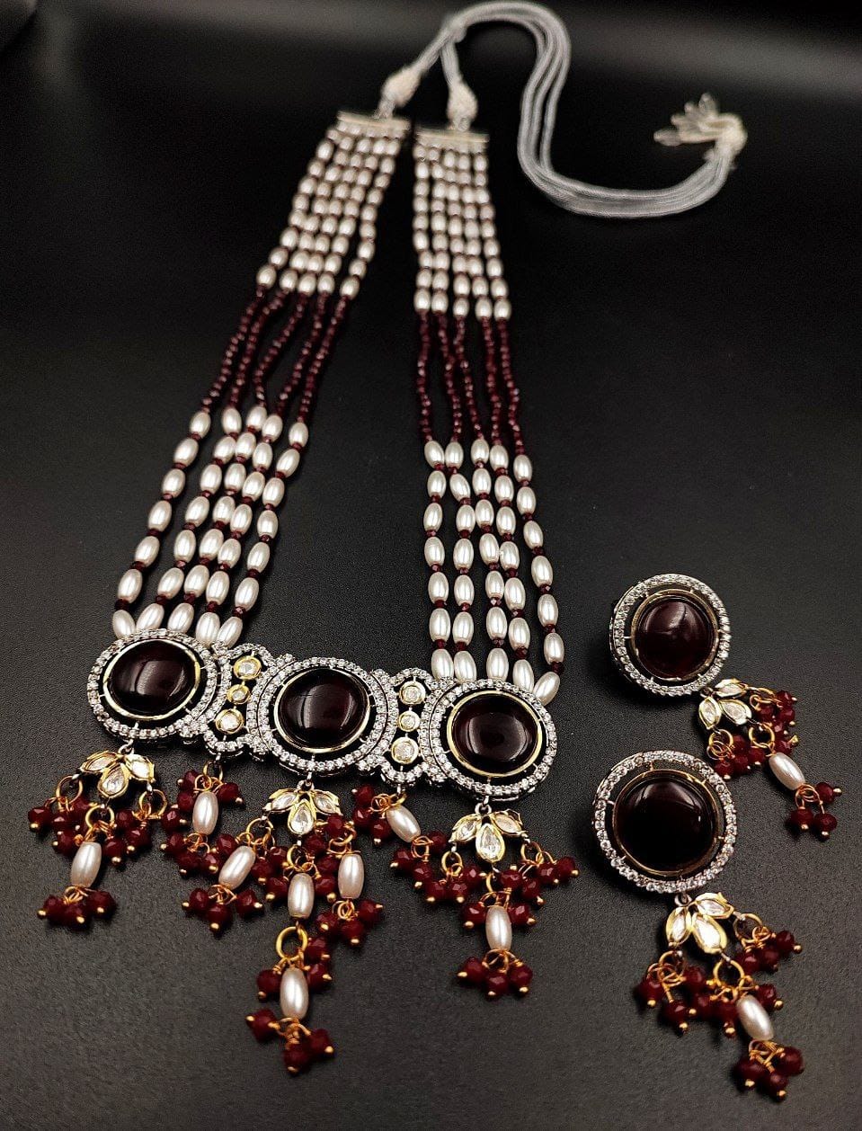 Maroon Elegant Kundan Monalisa Necklace Earring Set Party Wear Pearl Long Necklace Set Wedding Jewellery