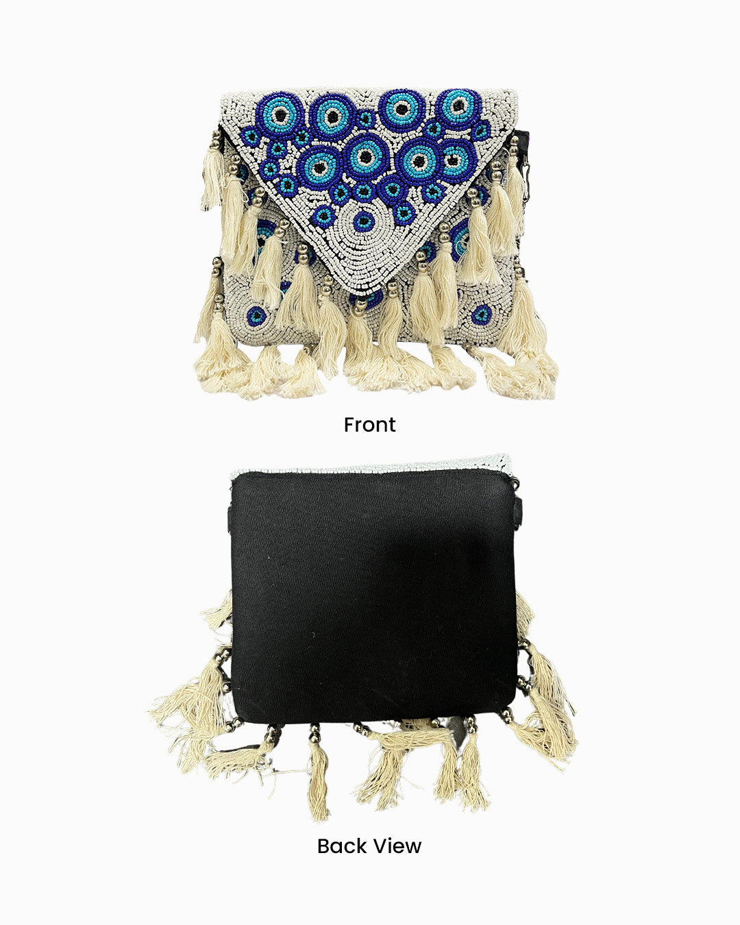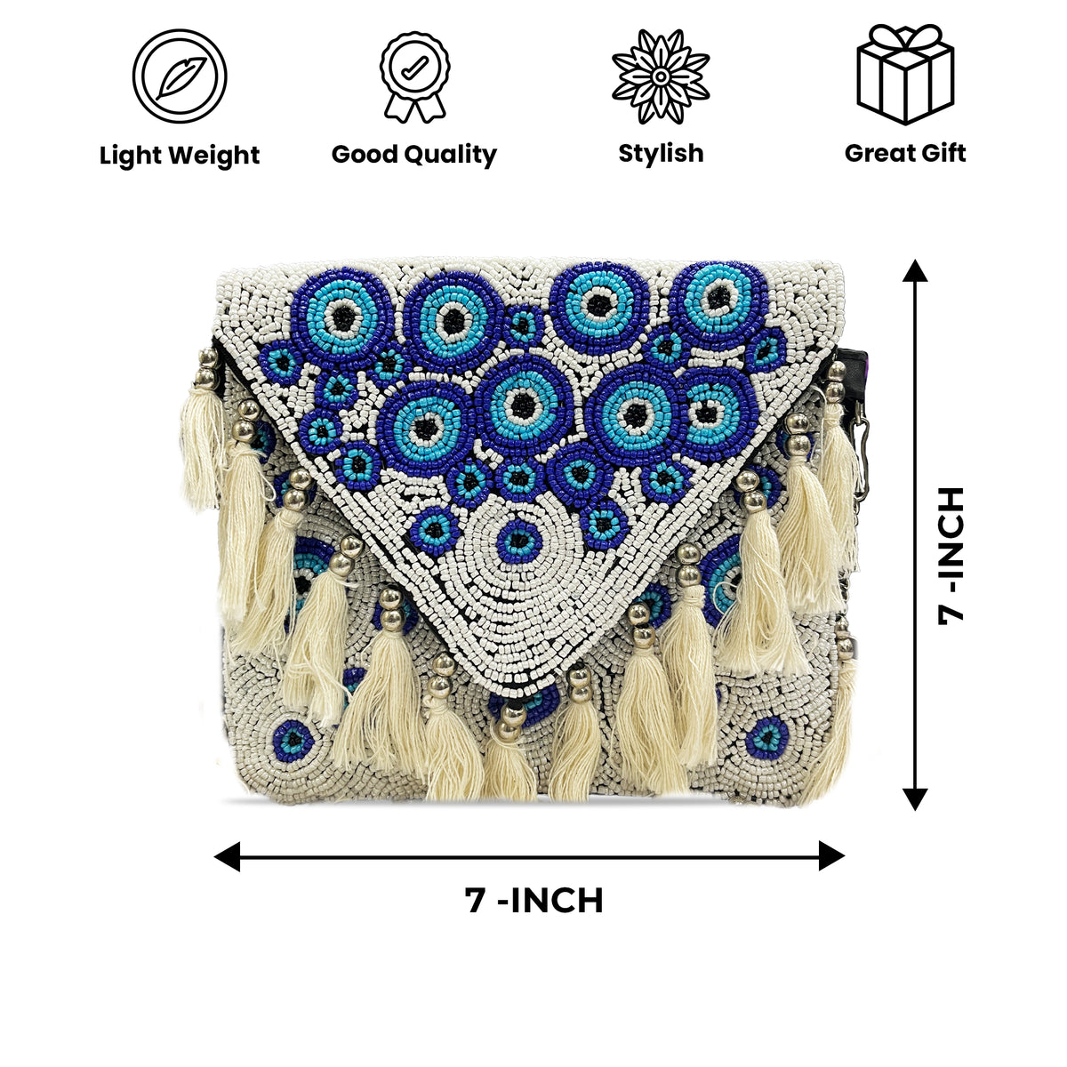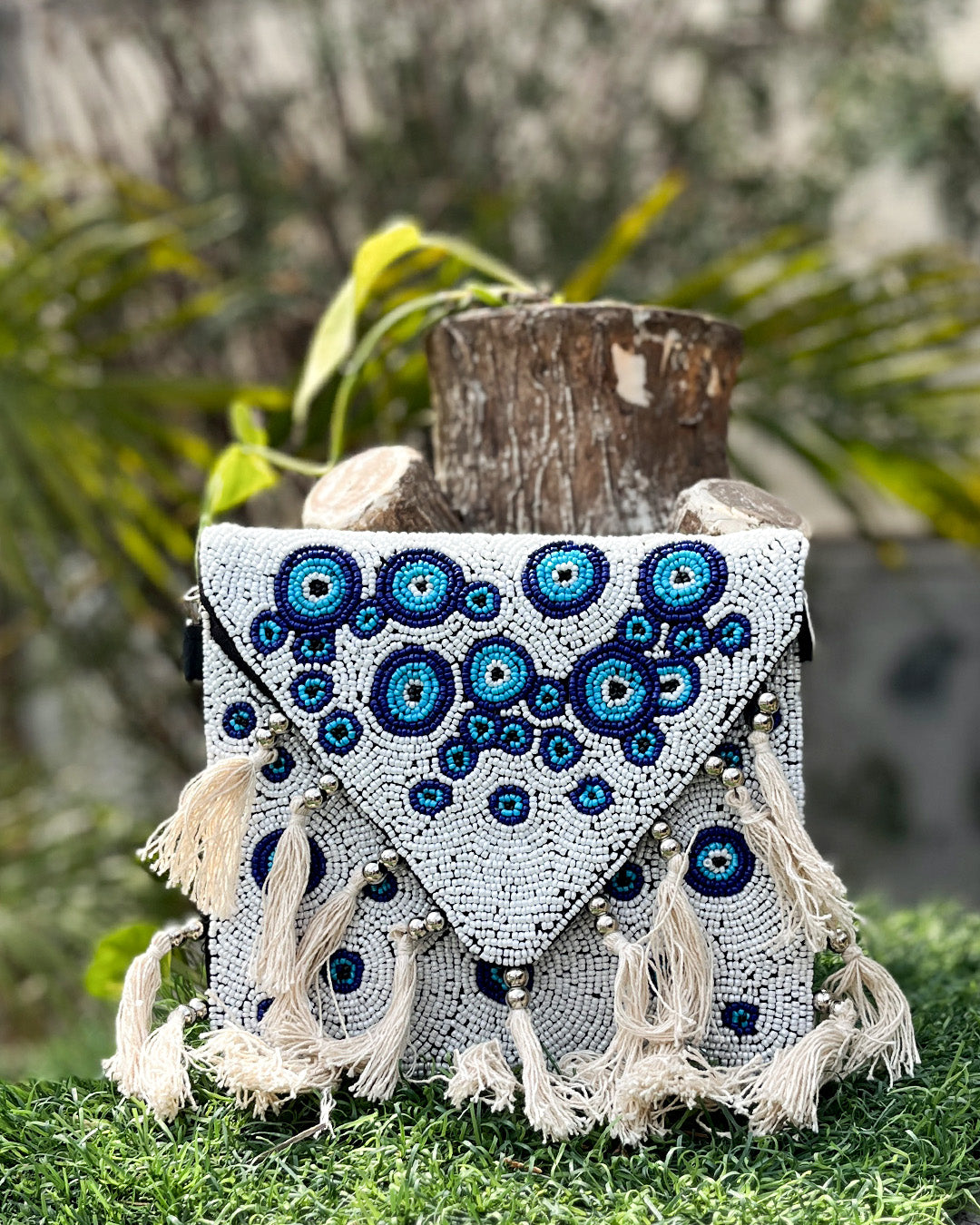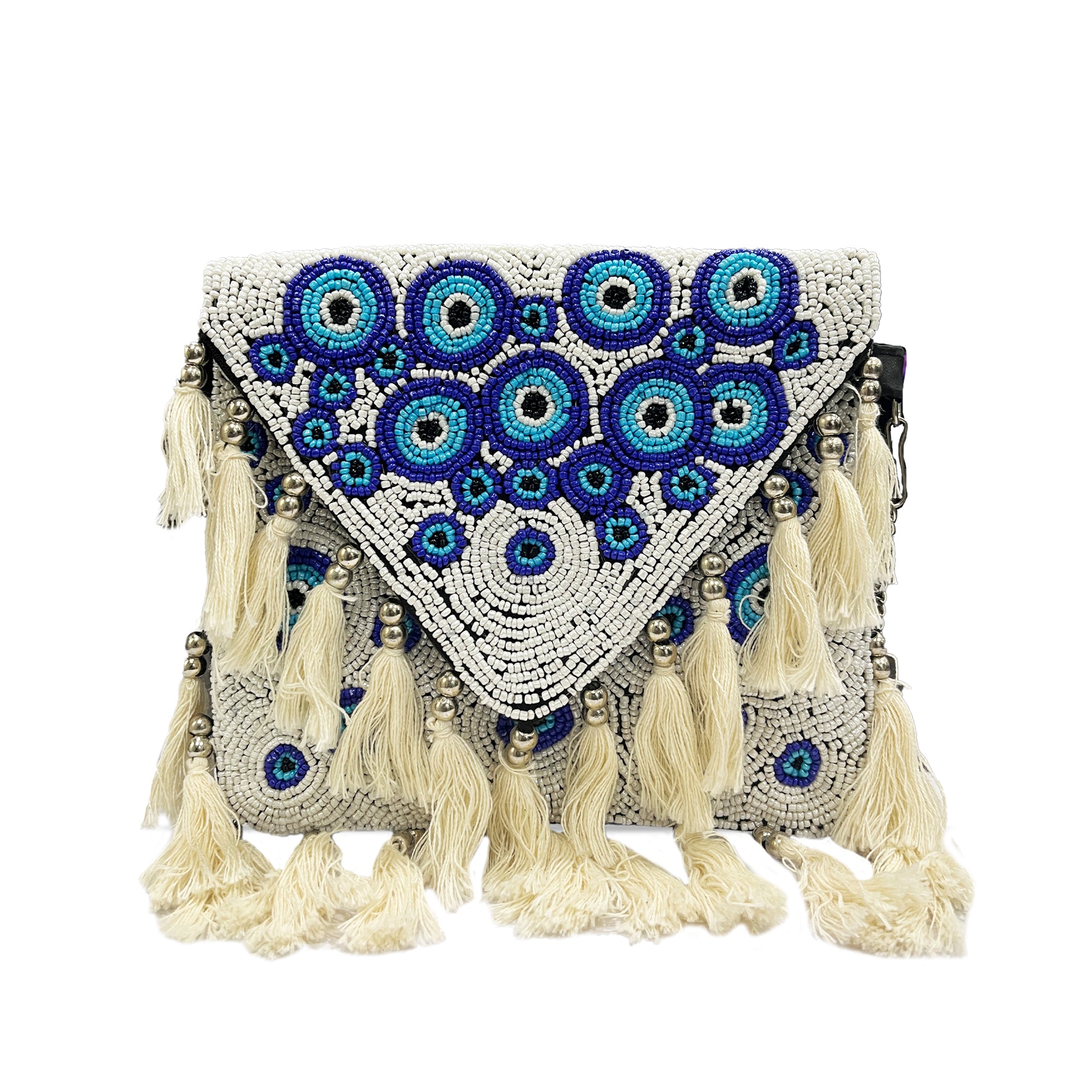 Handcrafted Blue & White Banjara Beaded Crossbody Boho Purse for Casual Outing Bohemian Tassel Bag for Women, Gift for Her