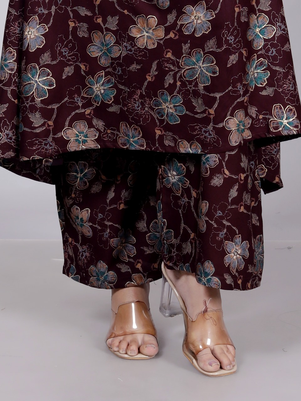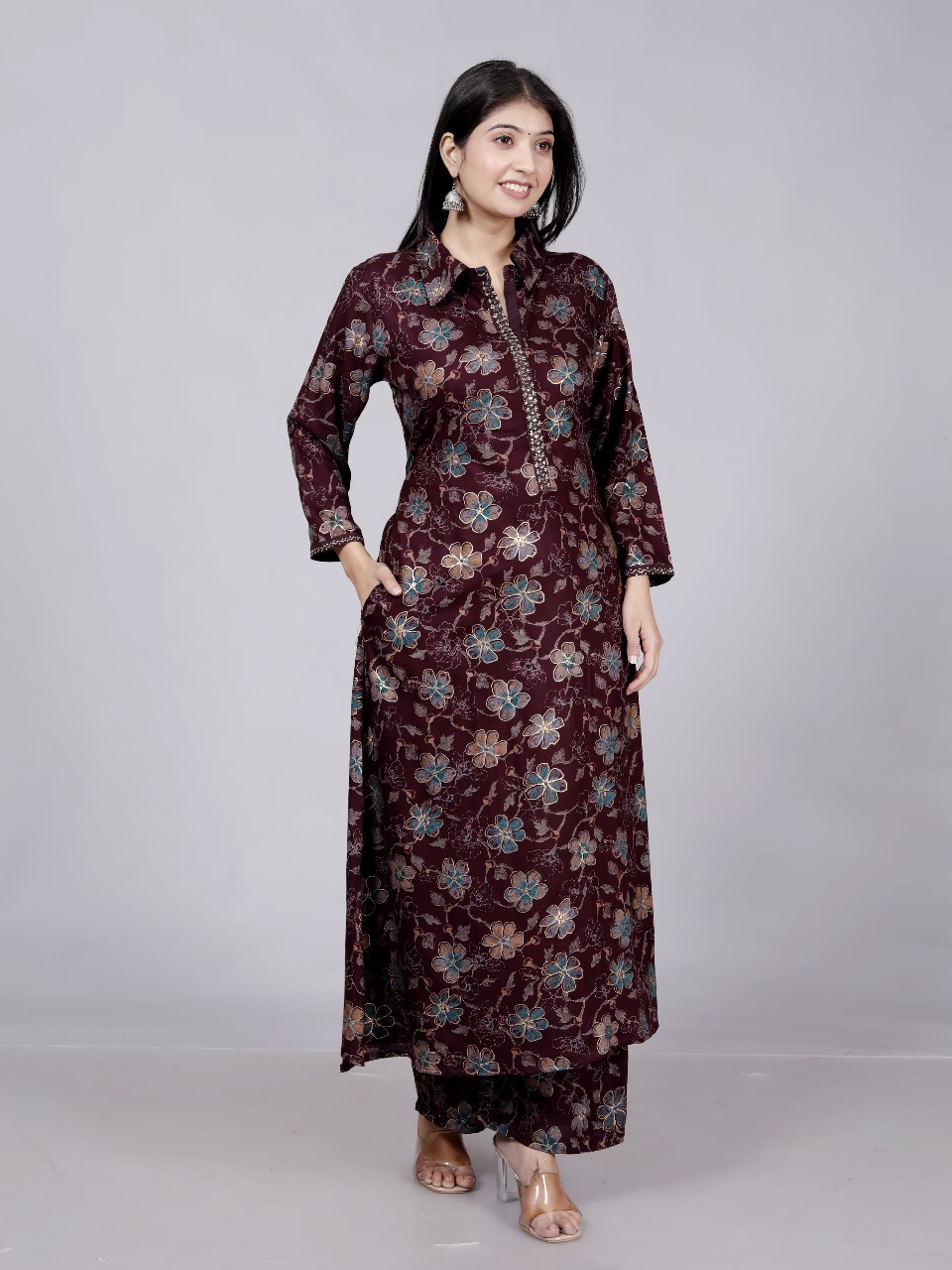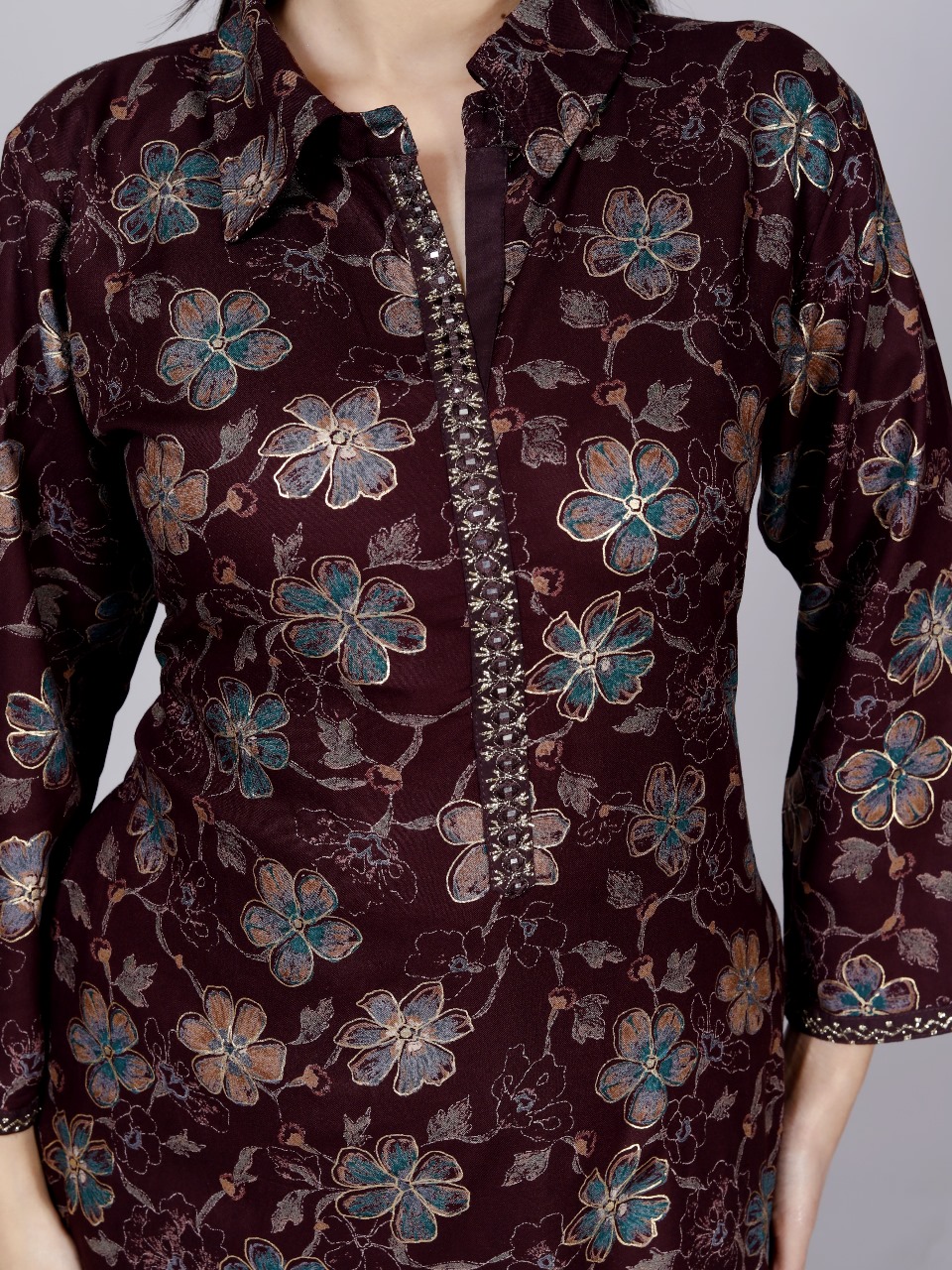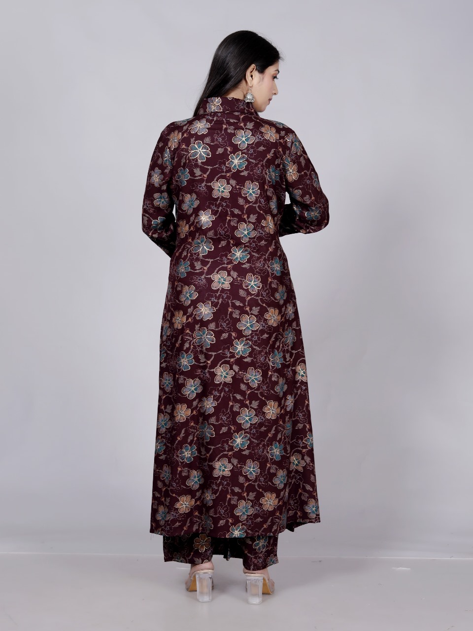 Black Floral Printed Indian Pakistani Readymade A line Salwar Kameez Collared Kurti Pant Co Ord Set for Women - Set of 2