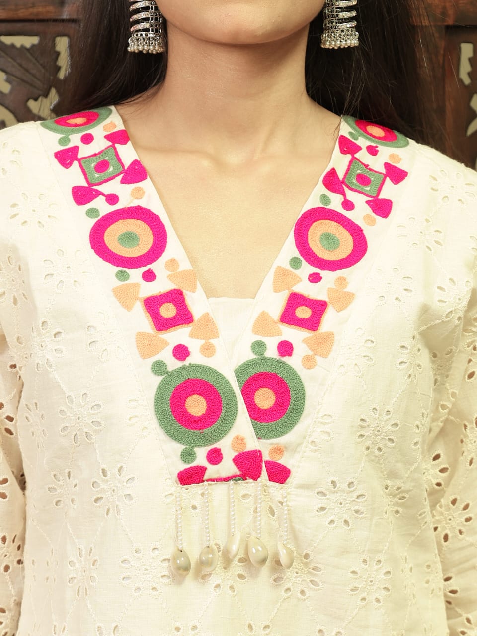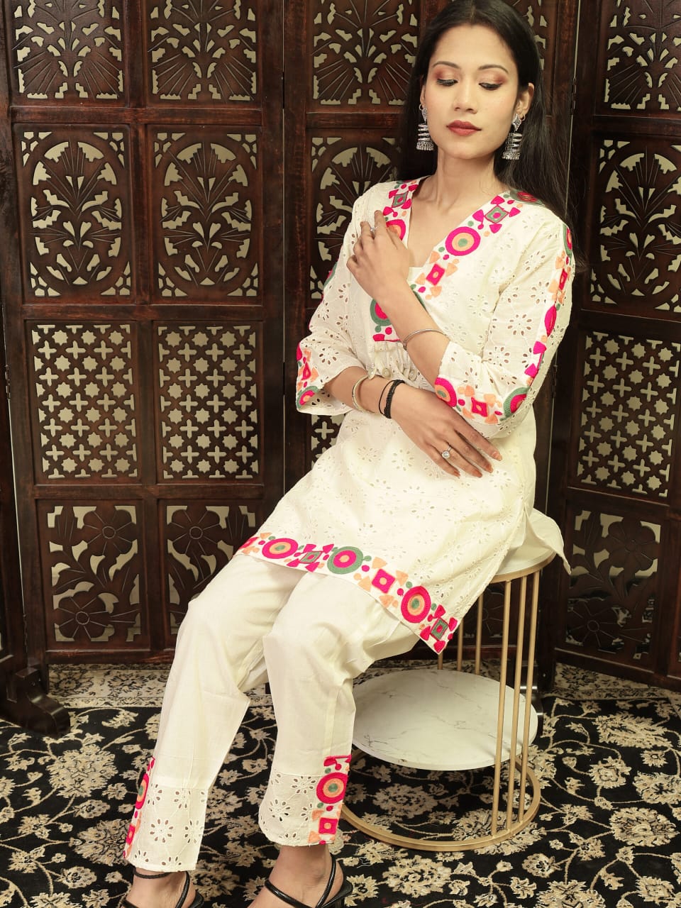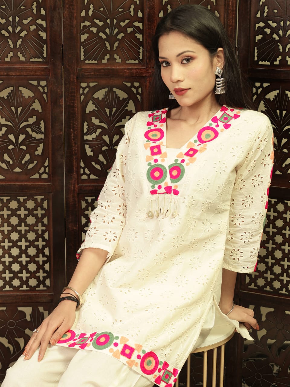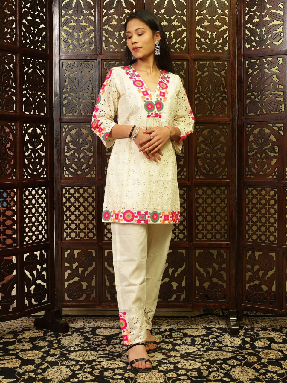 Mahima Off White Schiffli Embroidery & Kaudi Work Indian Salwar Kameez Kurti Top Pant Co Ord Set