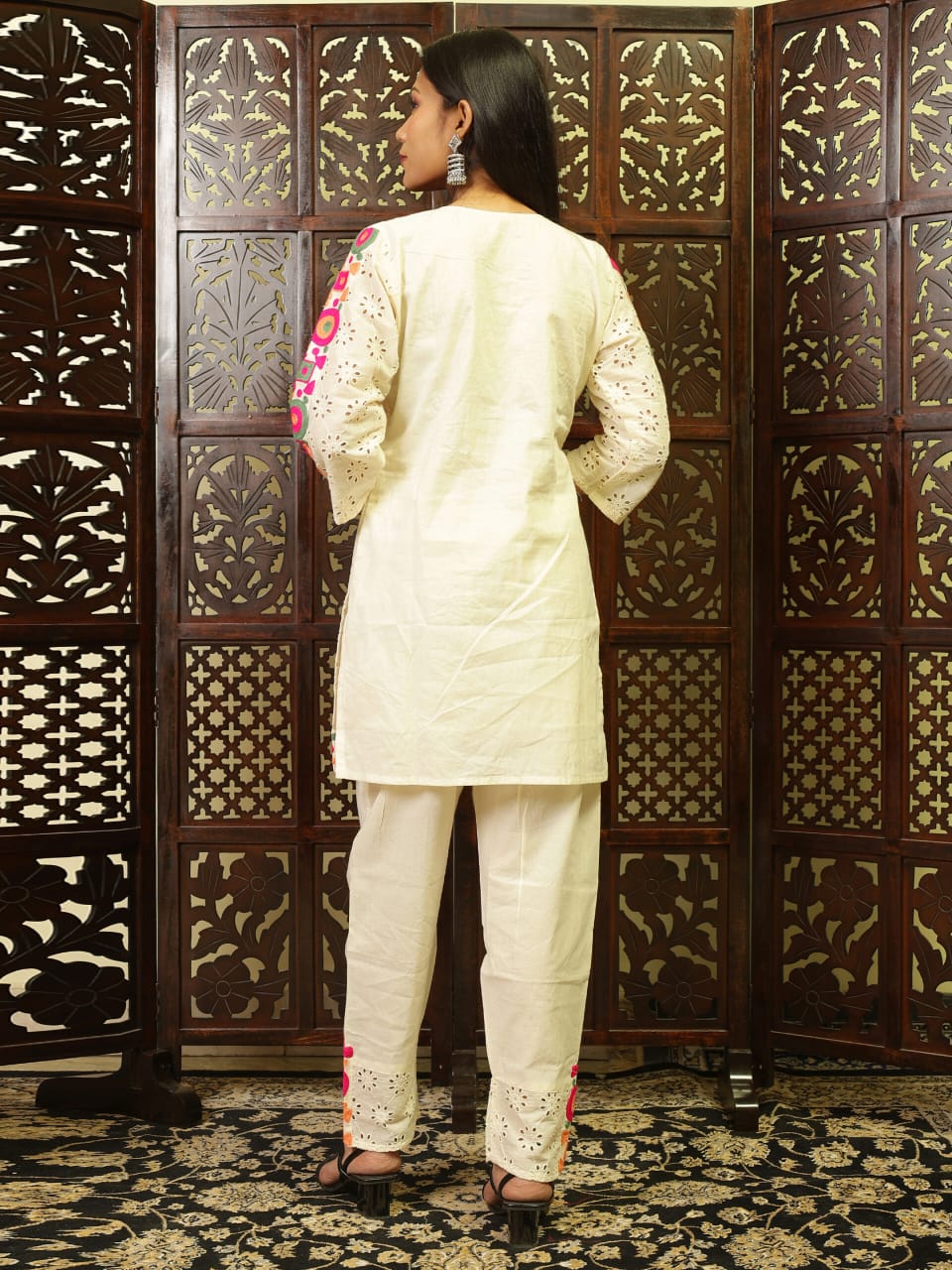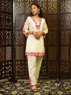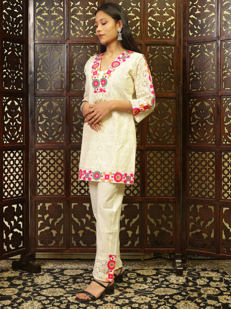 Mahima Off White  Schiffli Embroidery & Kaudi Work Indian Salwar Kameez Kurti Top Pant Co Ord Set