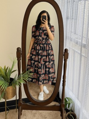 Black Kamdhenu Cow Floral Printed Half Sleeves Midi Gown Knee Length Kurti Dress for Women