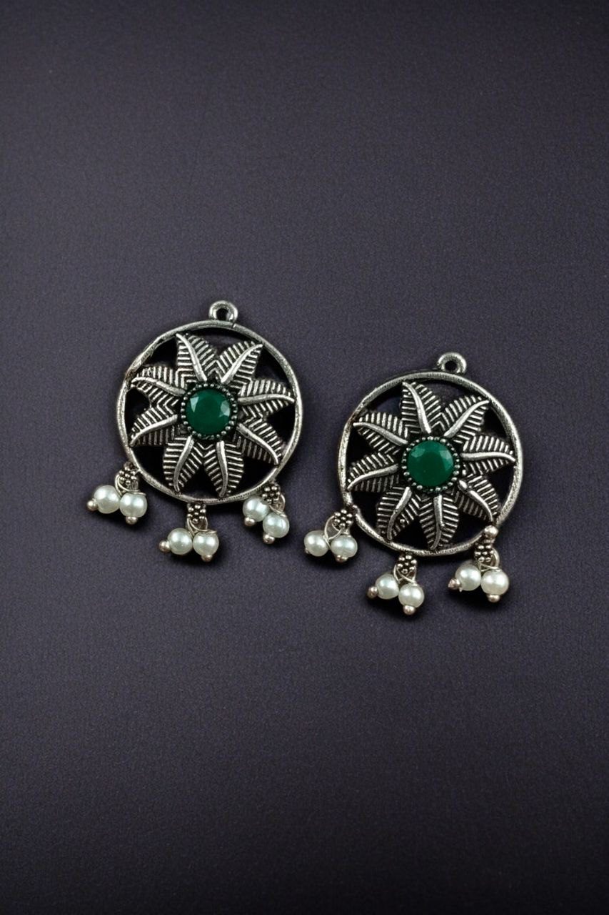Green Gorgeous Designer Rustic Round Flower Tops Silver Oxidized Earring Stud with Pearl Beads Drop for Girls