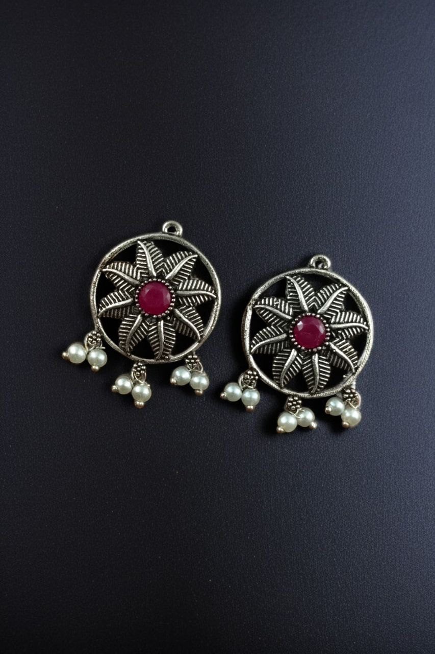 Red Gorgeous Designer Rustic Round Flower Tops Silver Oxidized Earring Stud with Pearl Beads Drop for Girls