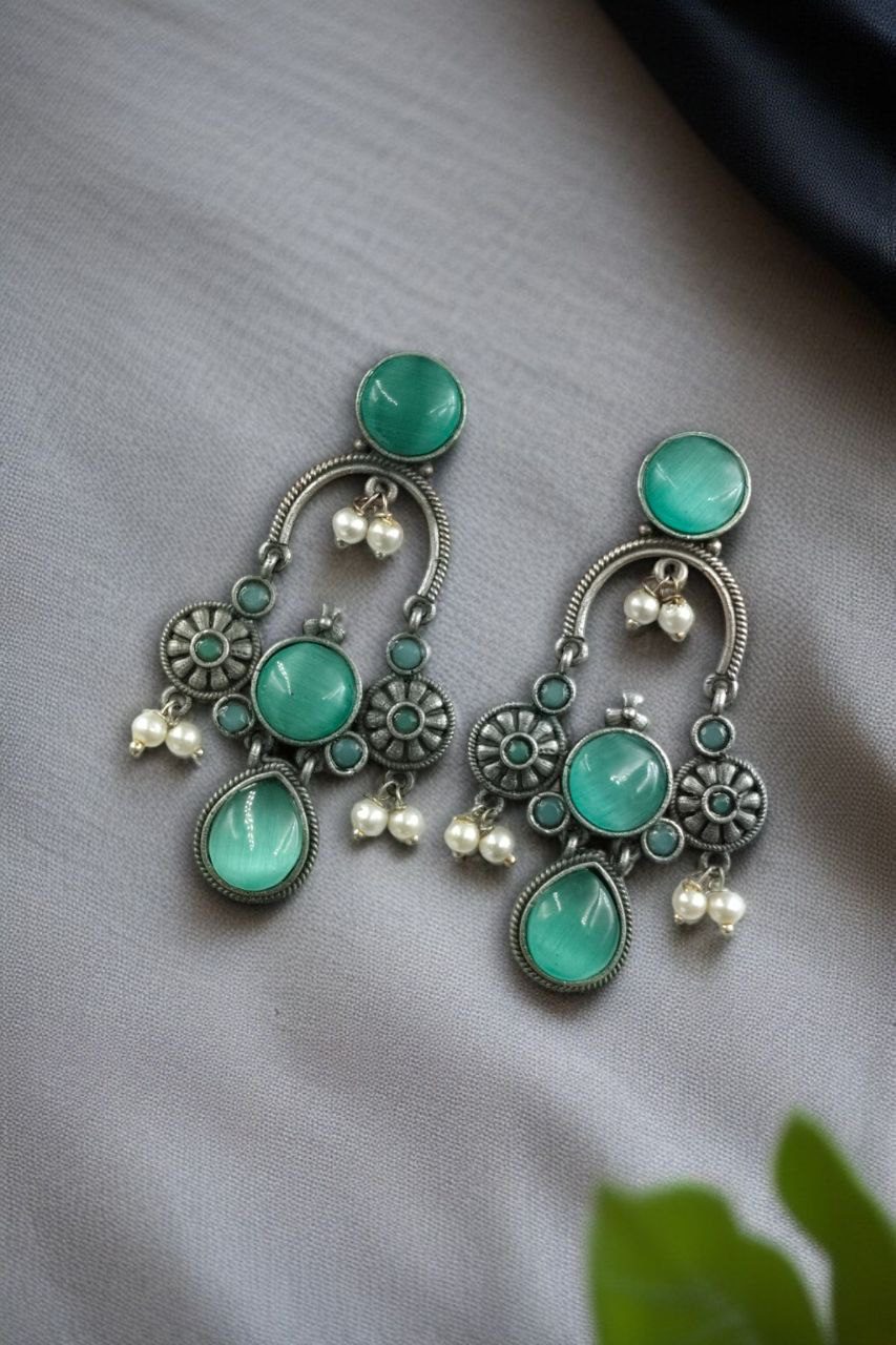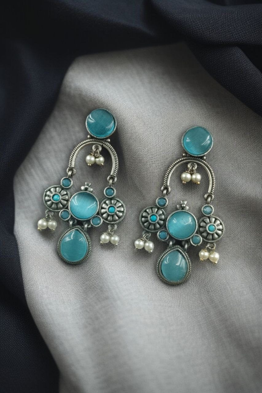 Aqua Antique Silver Dangler Earring Monalisa Stonework Chandelier Bohemian Pakistani Earring Pearl Beads Drop