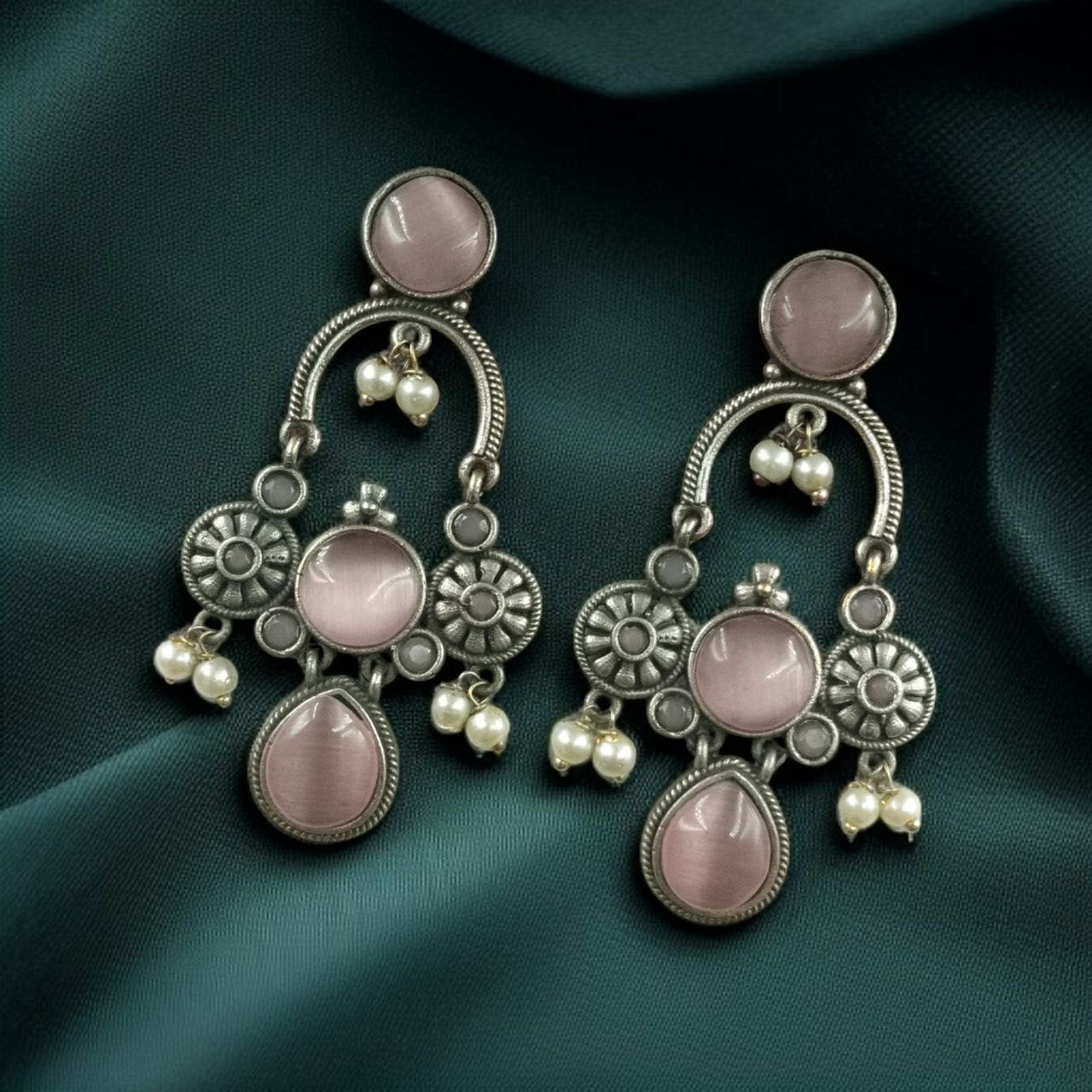 Baby Pink Antique Silver Dangler Earring Monalisa Stonework Chandelier Bohemian Pakistani Earring Pearl Beads Drop