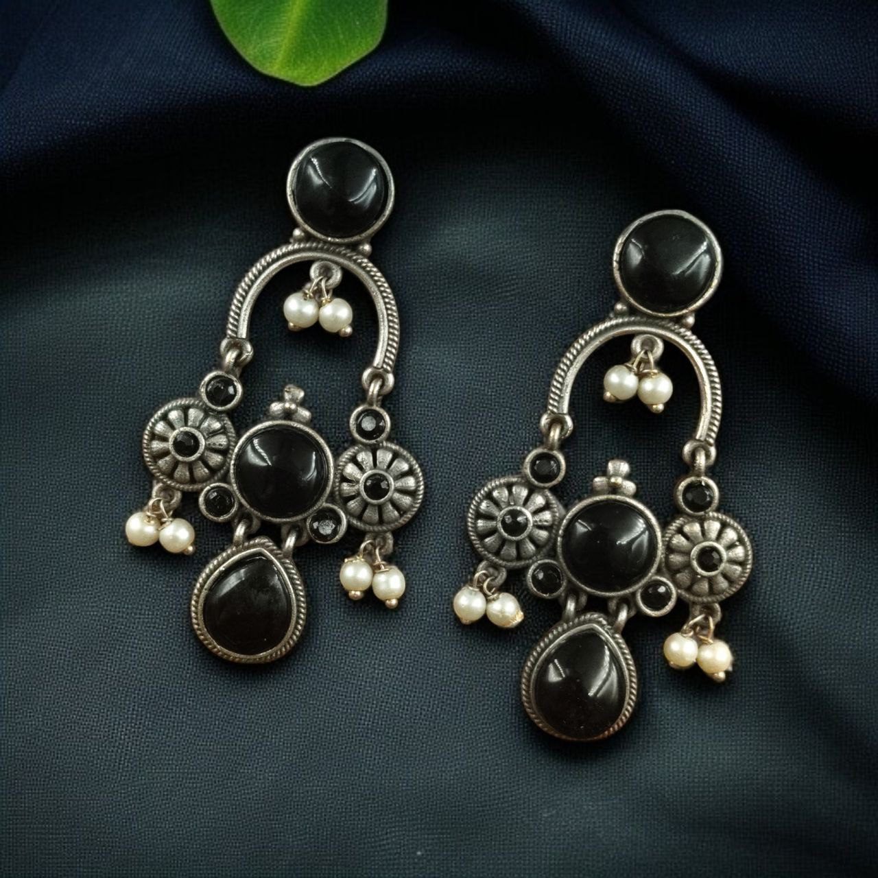 Black Antique Silver Dangler Earring Monalisa Stonework Chandelier Bohemian Pakistani Earring Pearl Beads Drop