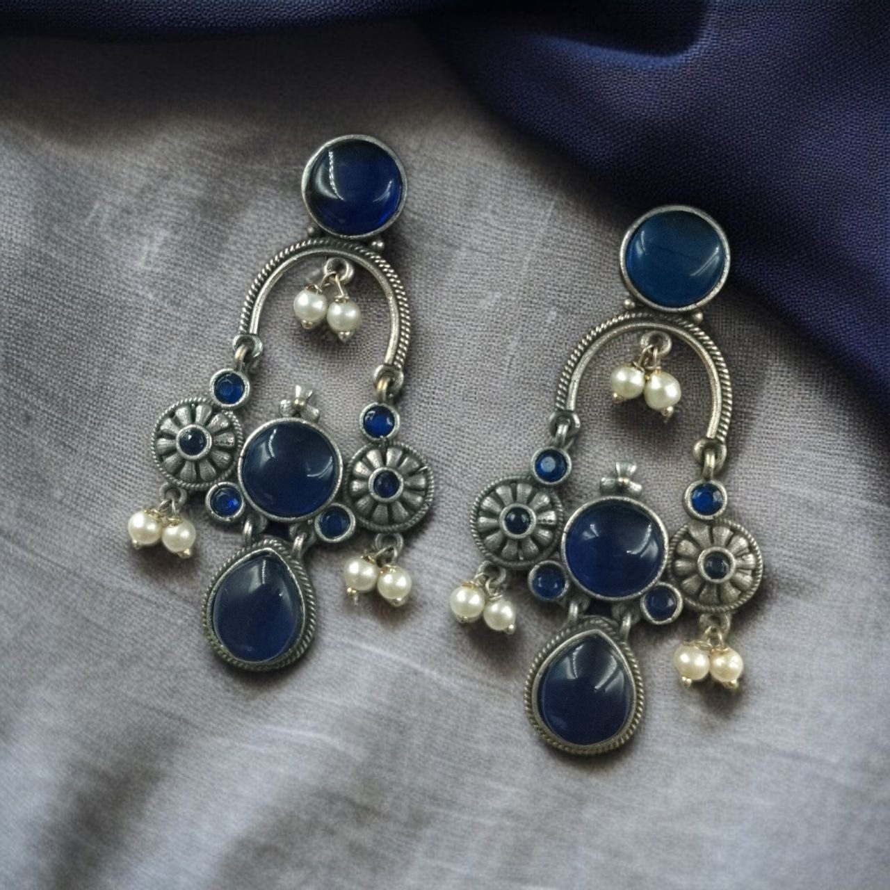 Blue Antique Silver Dangler Earring Monalisa Stonework Chandelier Bohemian Pakistani Earring Pearl Beads Drop
