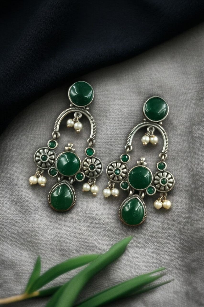 Green Antique Silver Dangler Earring Monalisa Stonework Chandelier Bohemian Pakistani Earring Pearl Beads Drop