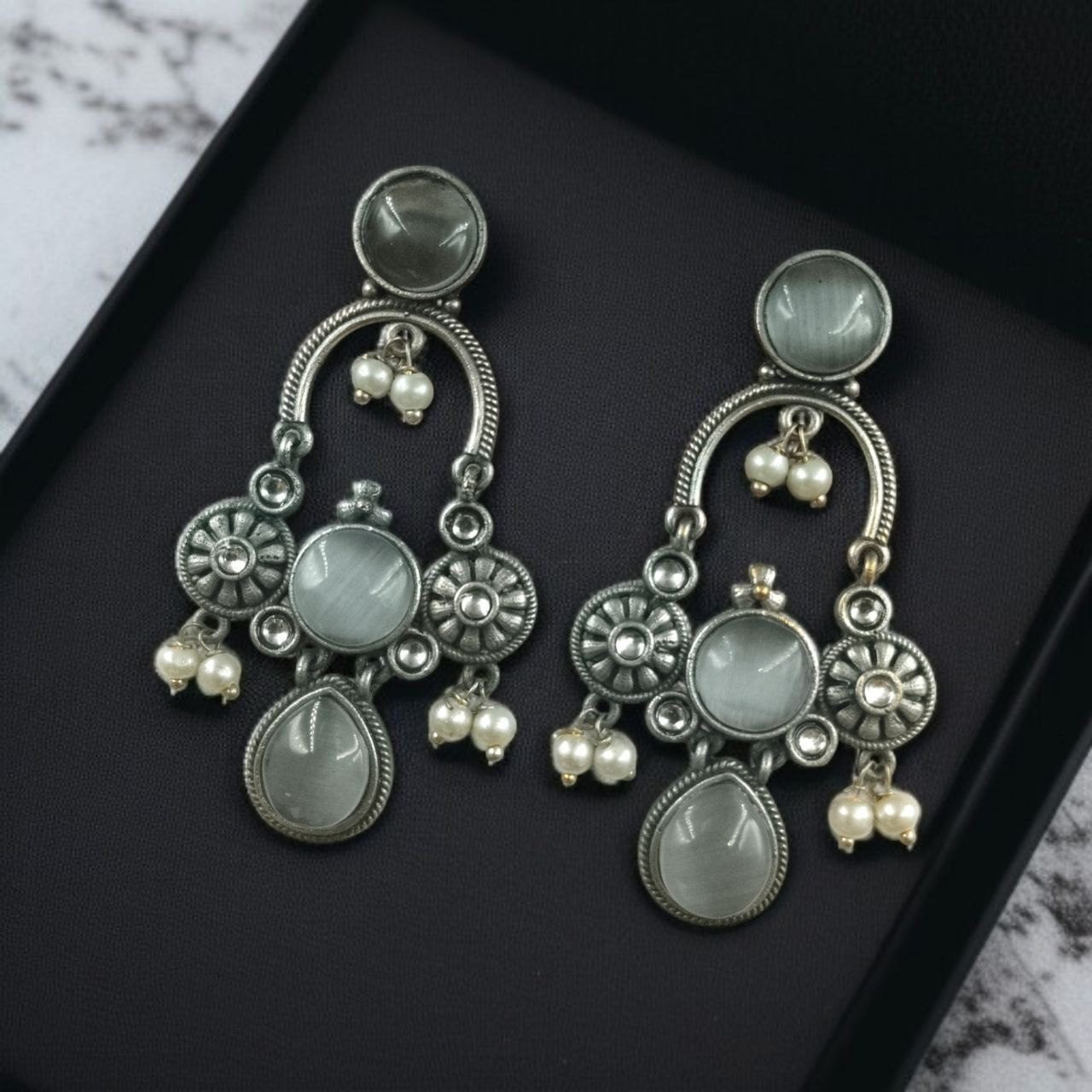 Grey Antique Silver Dangler Earring Monalisa Stonework Chandelier Bohemian Pakistani Earring Pearl Beads Drop