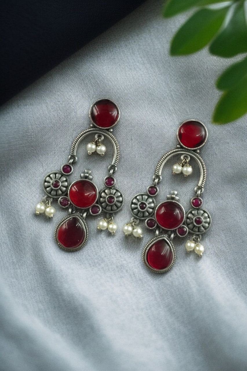 Red Antique Silver Dangler Earring Monalisa Stonework Chandelier Bohemian Pakistani Earring Pearl Beads Drop
