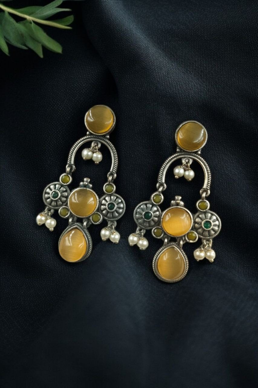 Yellow Antique Silver Dangler Earring Monalisa Stonework Chandelier Bohemian Pakistani Earring Pearl Beads Drop