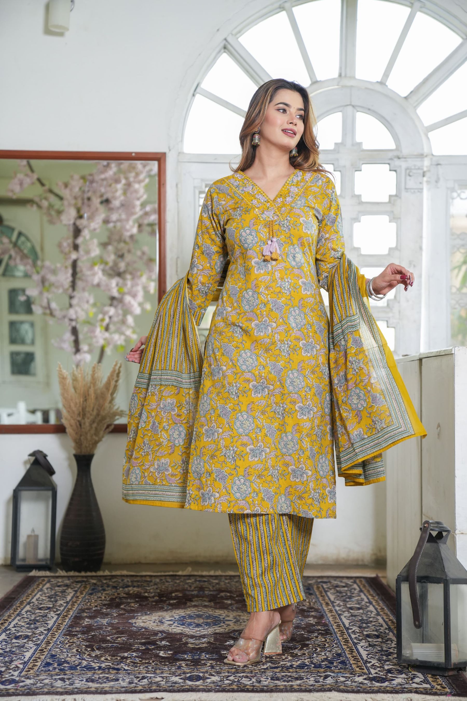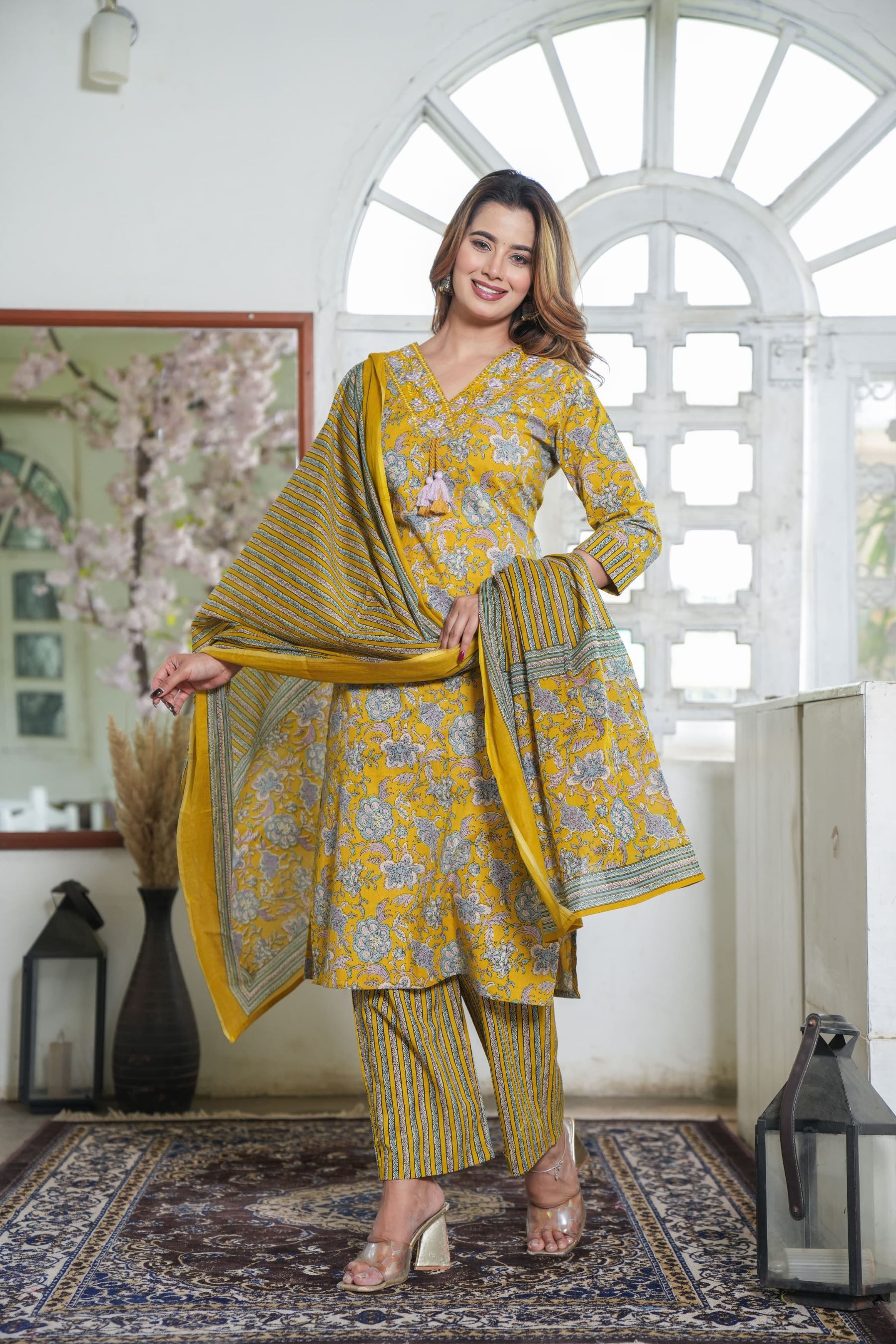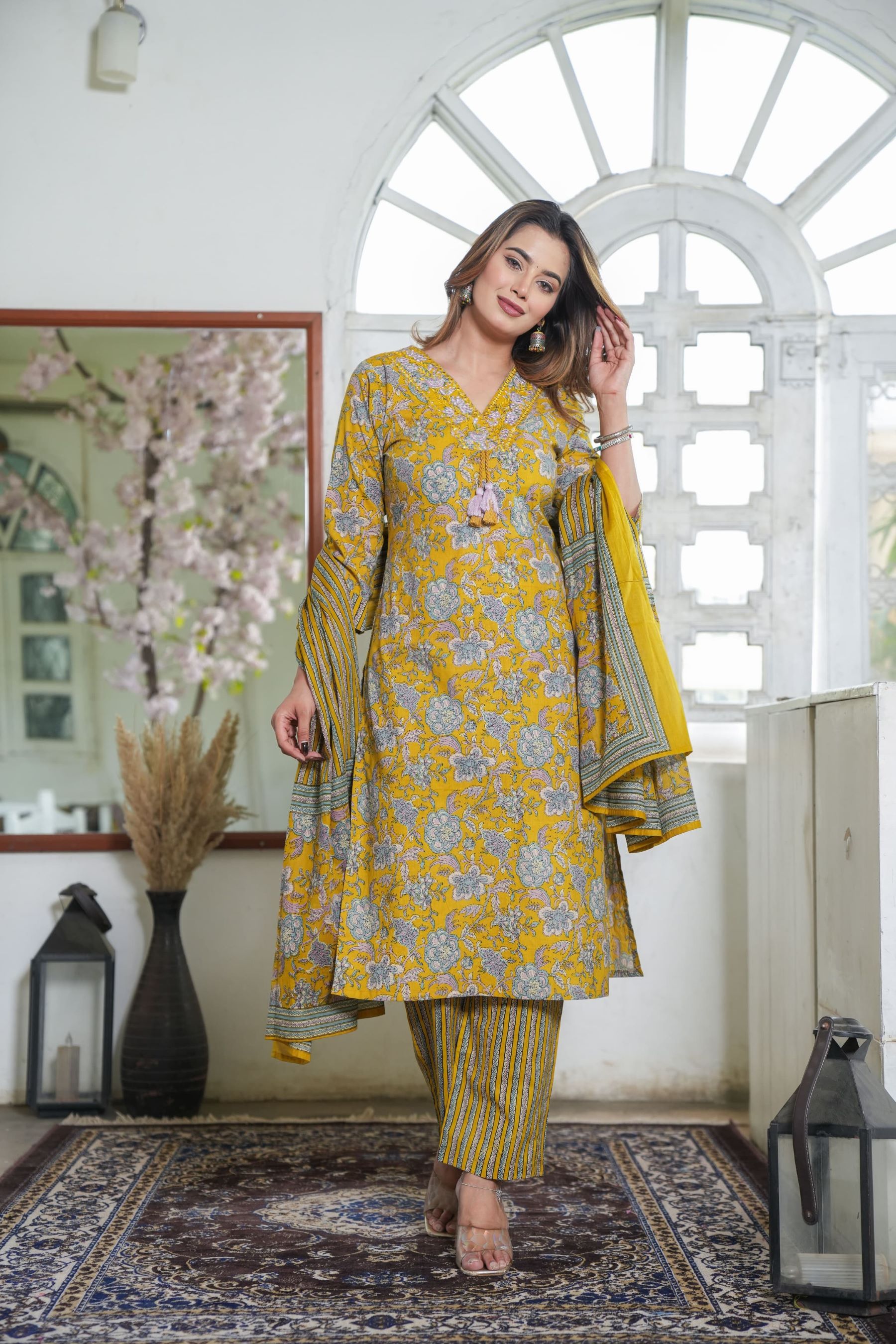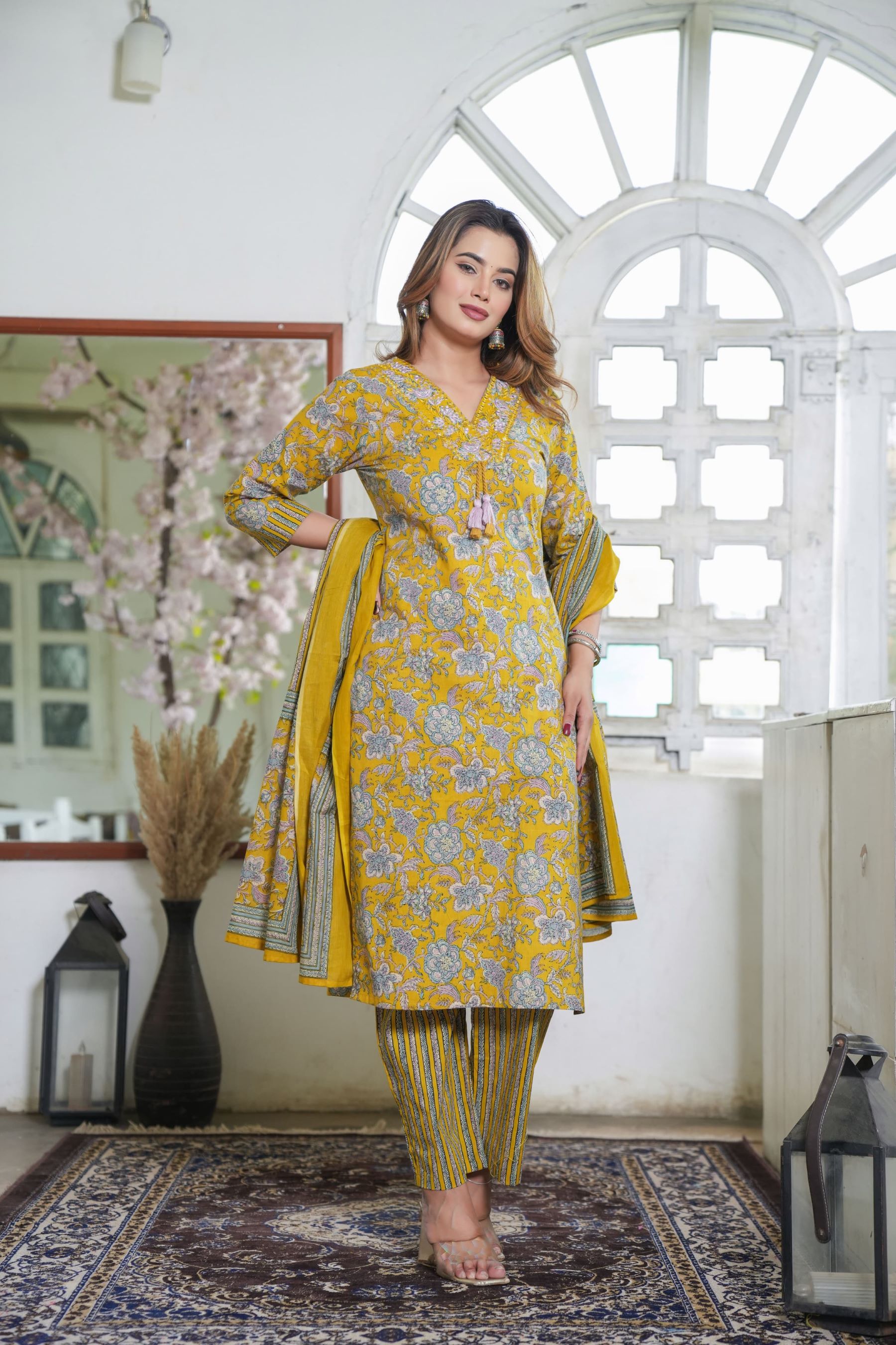 Yellow Floral Printed Indian Readymade Straight V-Neck Salwar Kameez Kurti Pant Dupatta Set for Women - Set of 3