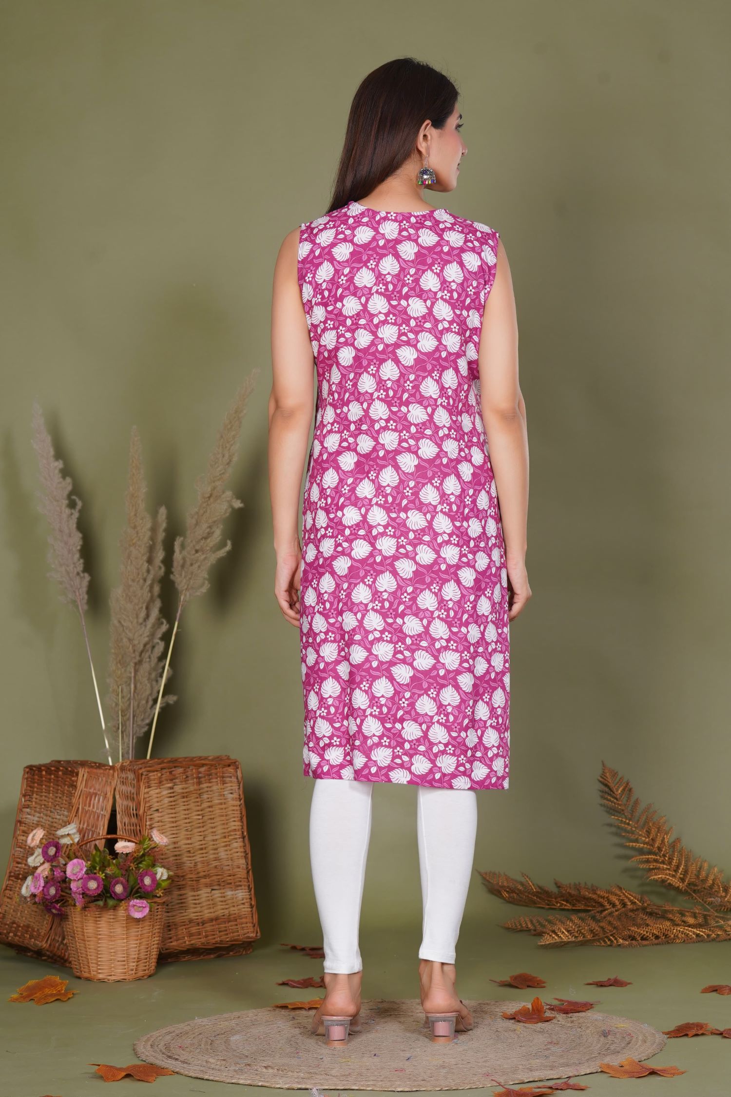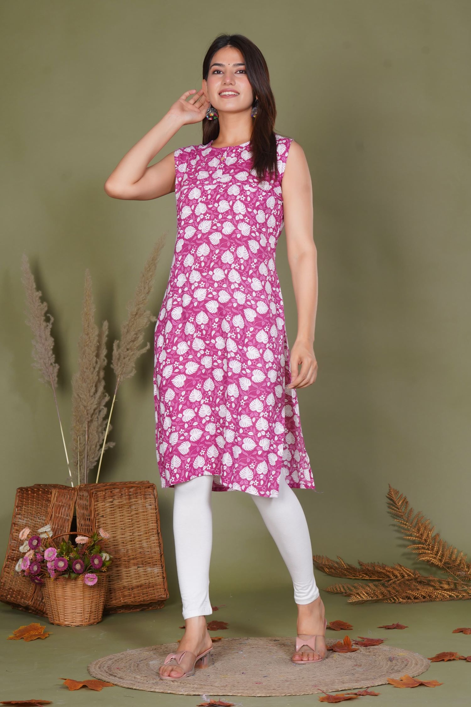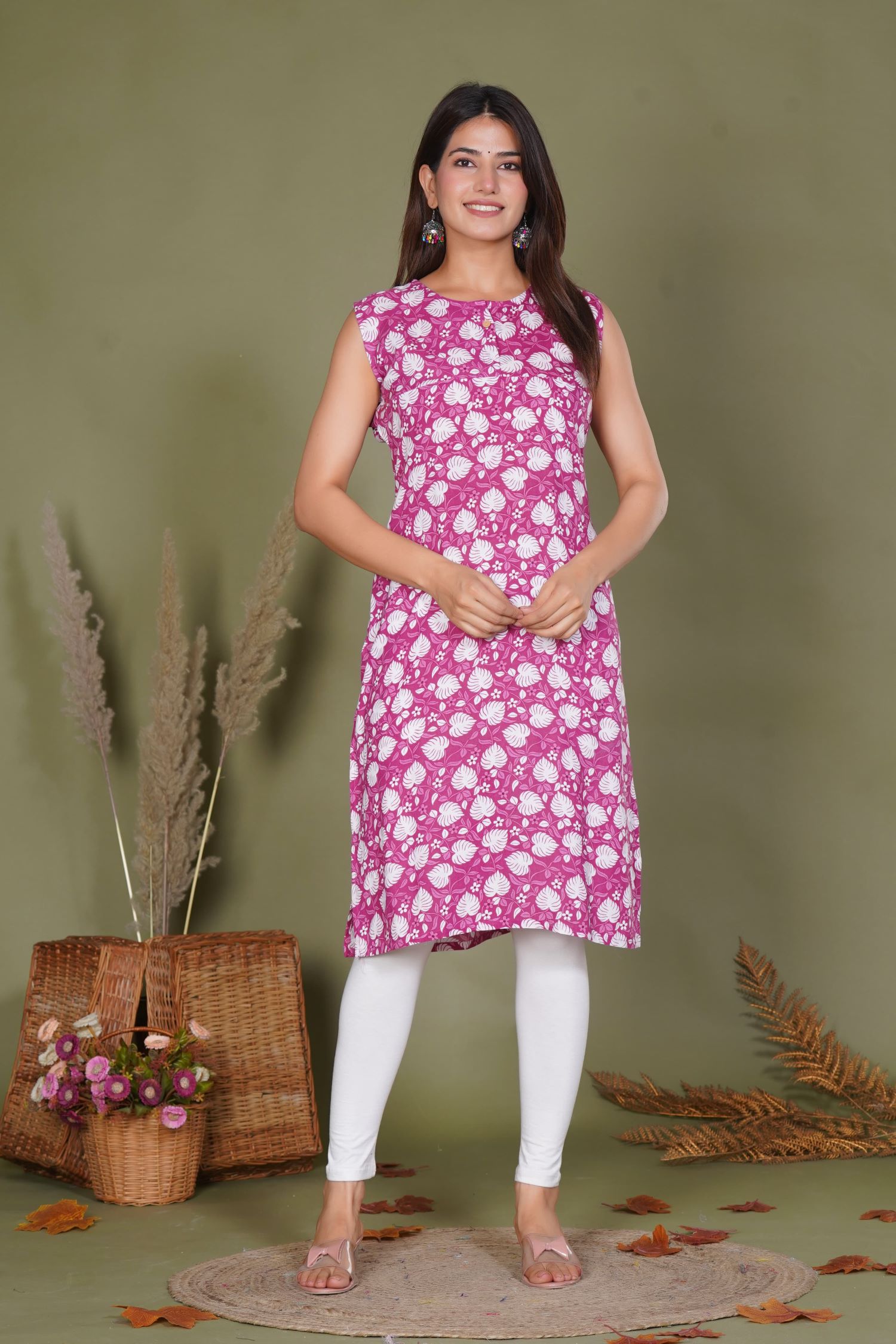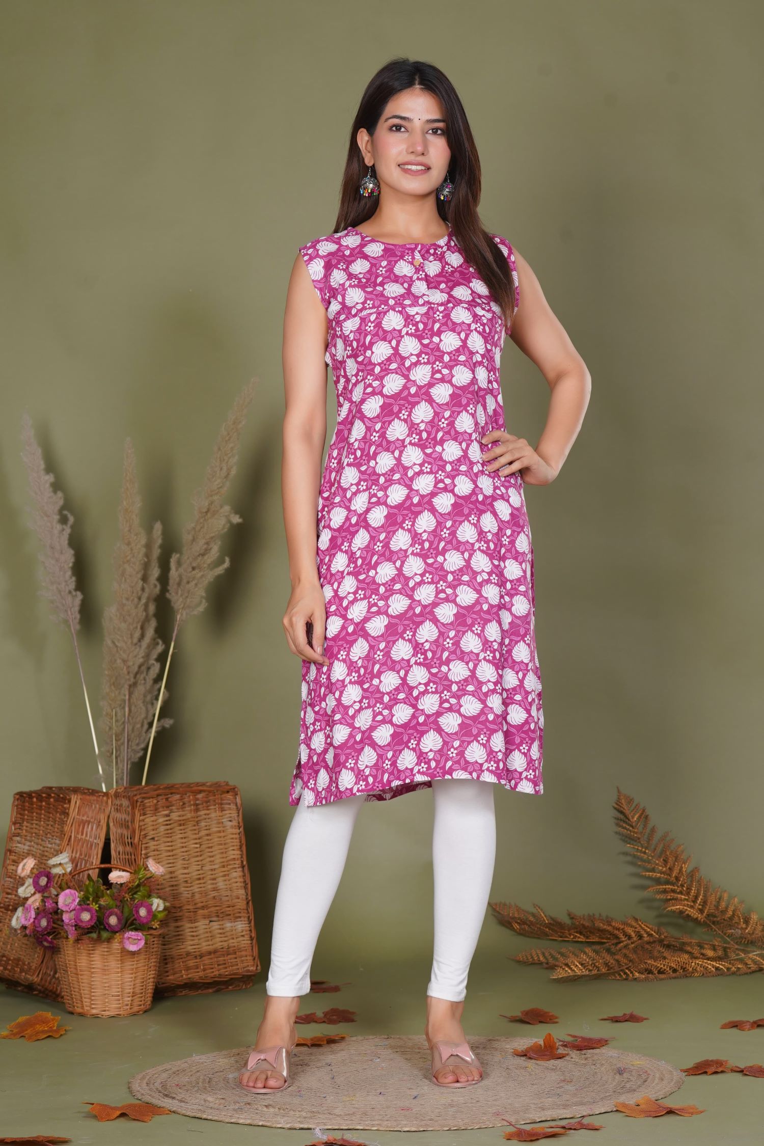 Pink Floral Print Rayon Straight Sleeveless Kurti Casual Tunic Top for Women - Kurti Only