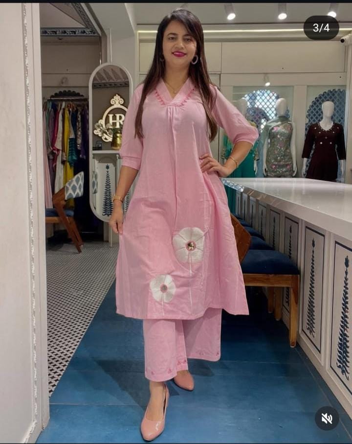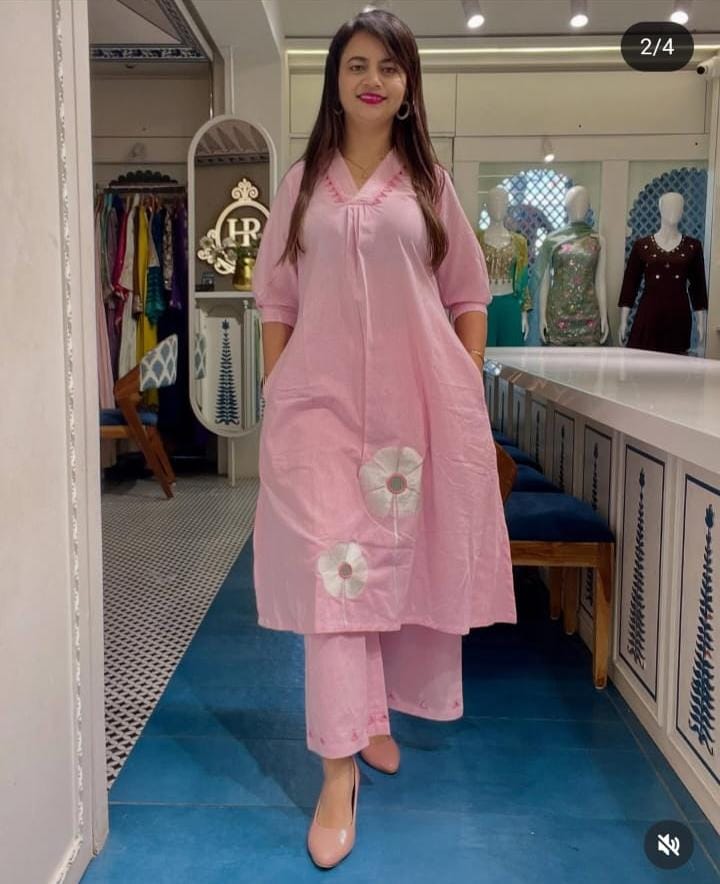 Pink Embroidered V-Neck Cotton Kurti Pant Co Ord Set Salwar Kameez for Women - Set of 2