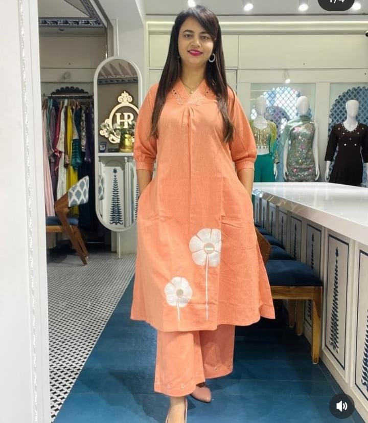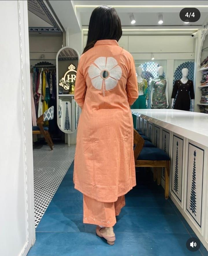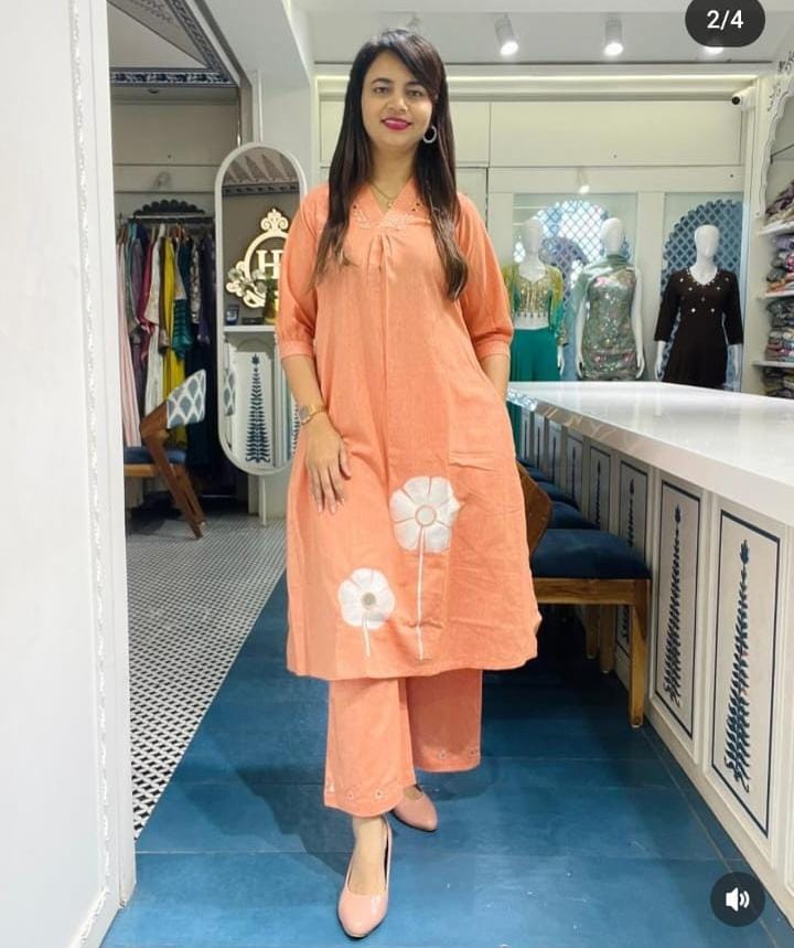 Peach Embroidered V-Neck Cotton Kurti Pant Co Ord Set Salwar Kameez for Women - Set of 2