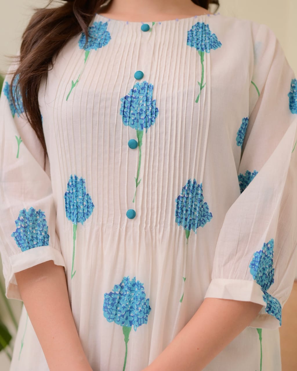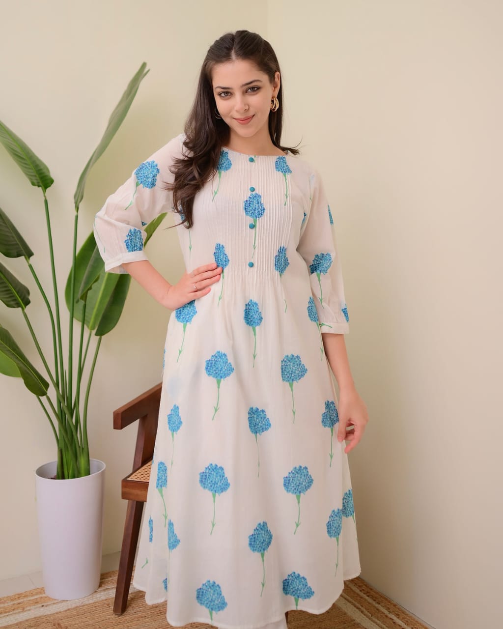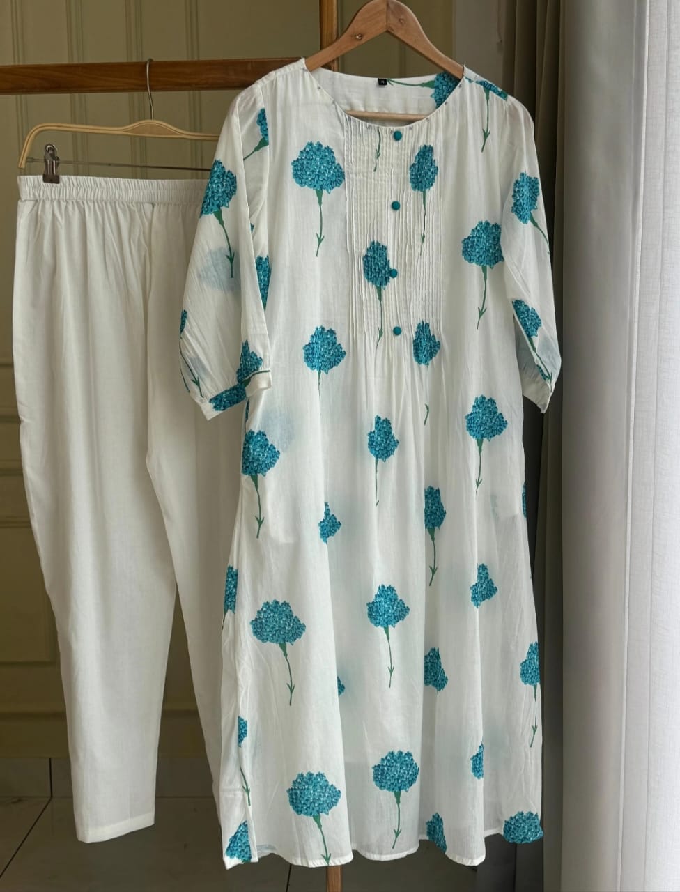 Blue White Floral Printed Cotton Aline Kurti Pant Co Ord Set Indian Pakistani Pintex Design Salwar Kameez with Pockets on Both Side
