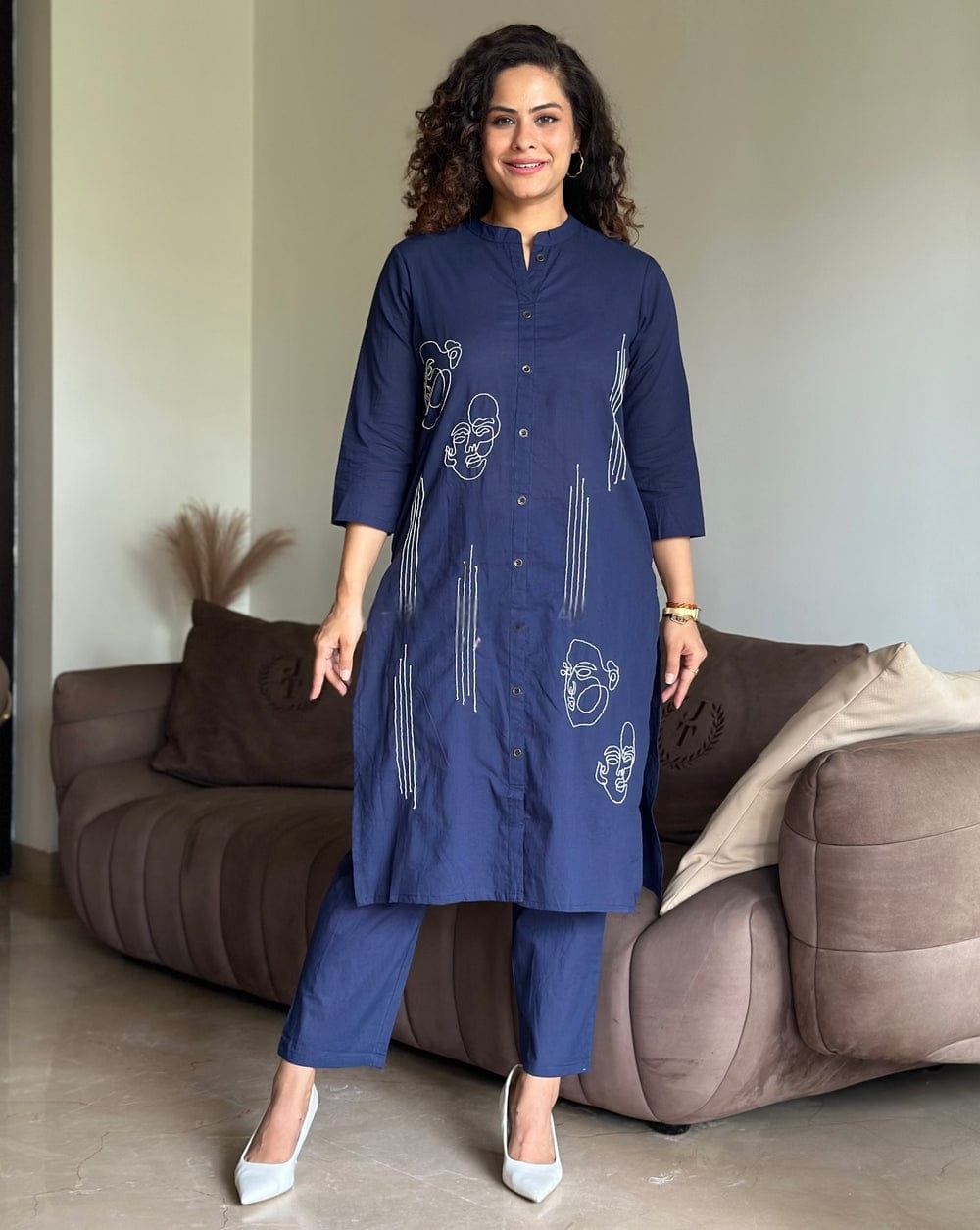 Elevate your everyday ethnic style with this elegant Blue Cotton Kurta Set. Crafted from premium quality pure cotton, the straight cut kurta features intricate white thread embroidery, a mandarin collar, and three-quarter sleeves ensuring breathable comfort and a timeless look. Paired with contrasting trousers and a convenient slip-on closure, this set is perfect for college, office, or casual outings. Stay cool, confident, and effortlessly stylish all day long. A must-have addition to your ethnic wardrobe!
