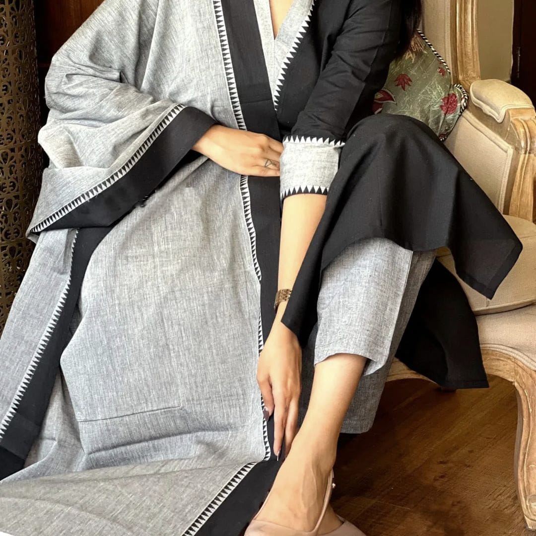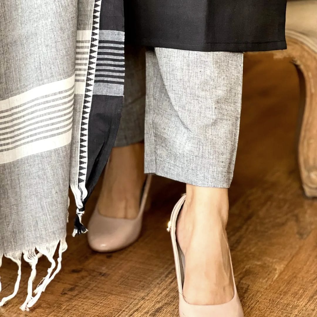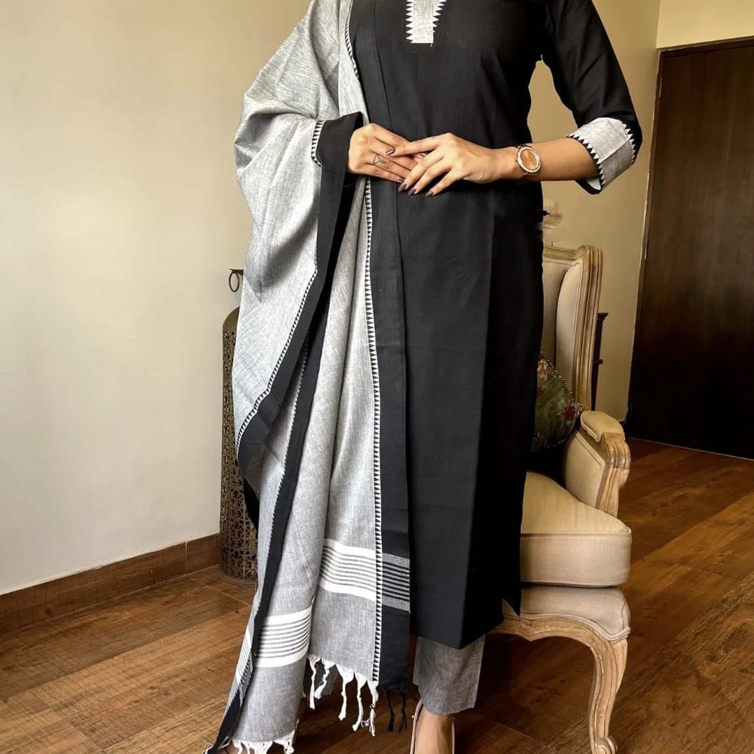 Black Handloom South Cotton Kurta Pant Dupatta Straight Salwar Kameez For Women (Set Of 3)
