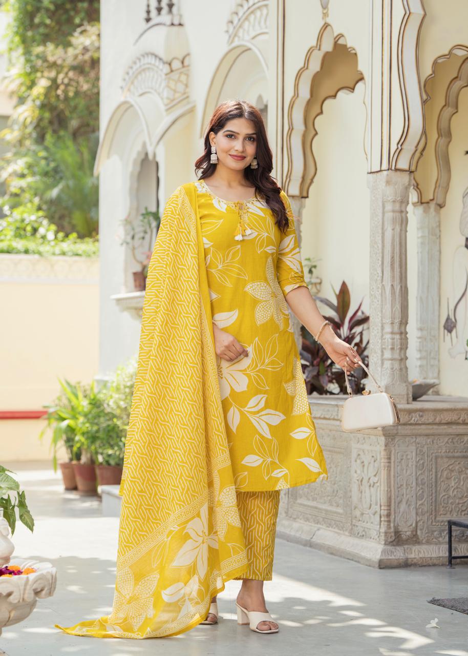 Yellow Floral Printed Embroidery On Neck Straight Fit Cotton Kurti Pant Dupatta Salwar Kameez - Set Of 3