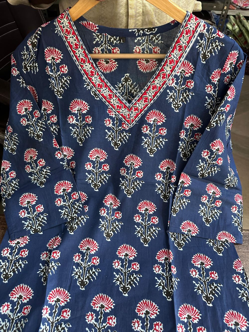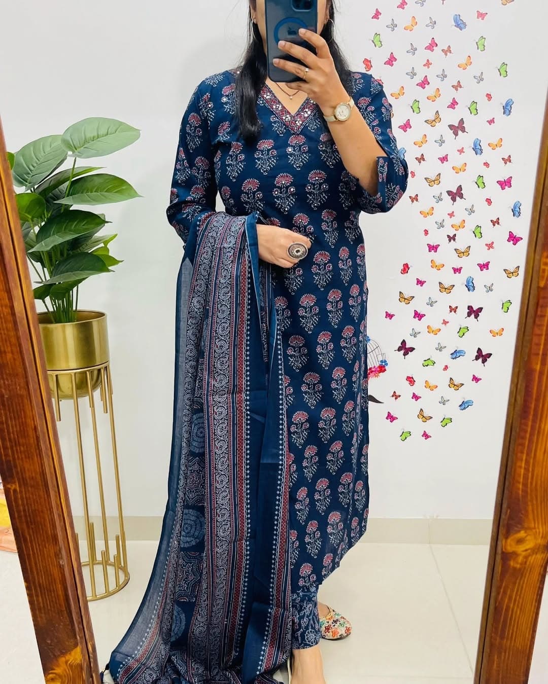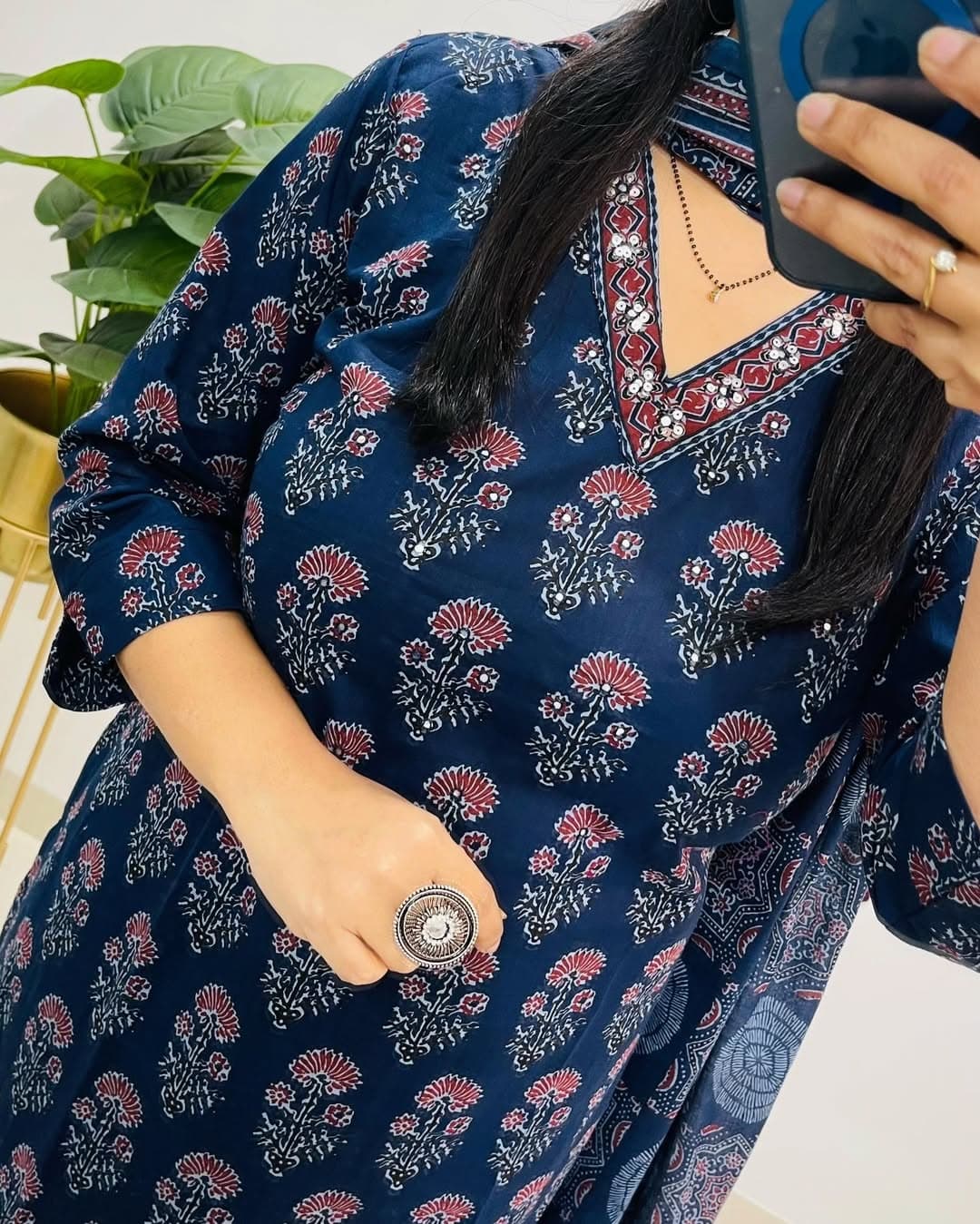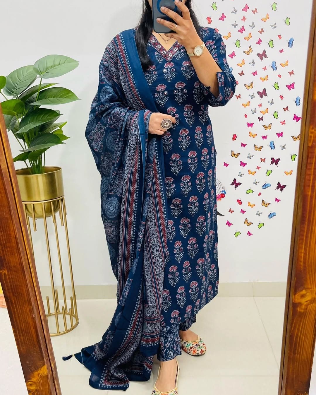 Blue Printed V-Neck Straight Fit Cotton Kurti Pant Dupatta Salwar Kameez - Set Of 3